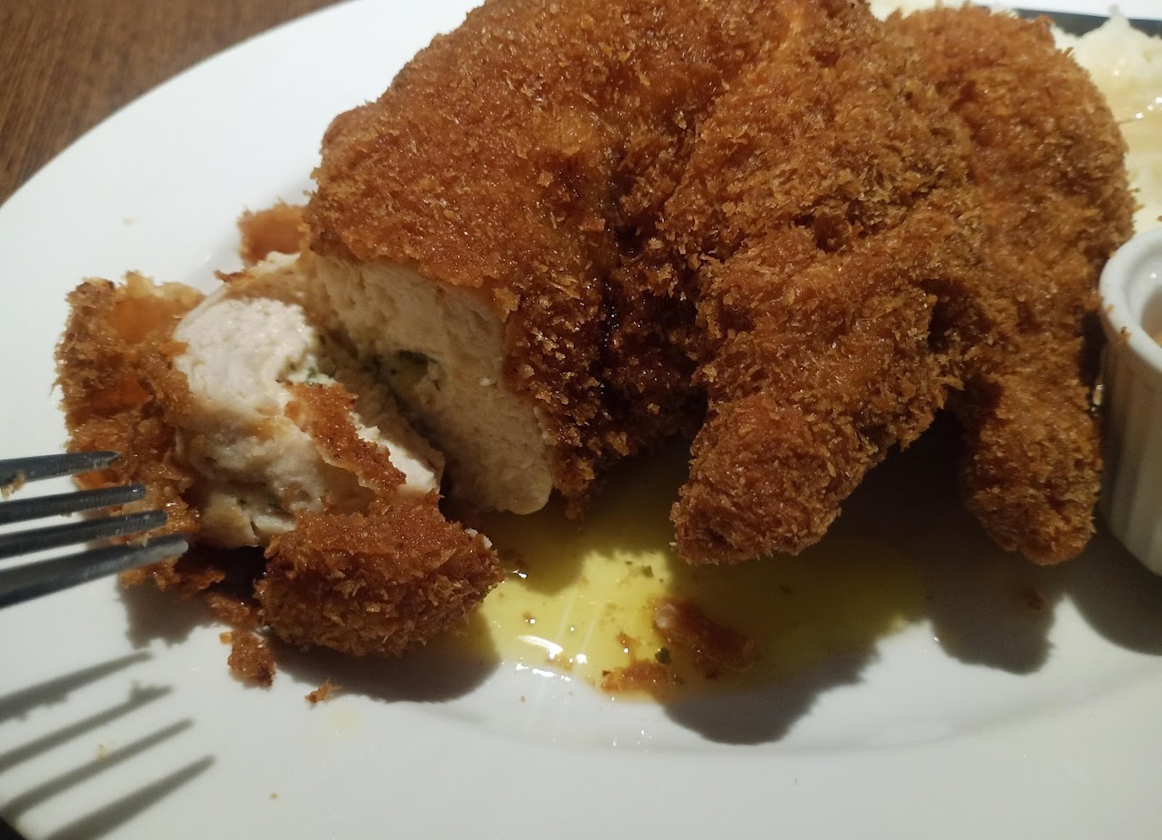 基輔炸雞切開會流出大量蒜香奶油,帶有檸檬的香氣,外皮炸的酥酥的雞胸肉沾著內餡一起吃,微酸不膩口~店家還提醒切的時候要小心,不然內餡會噴出來?