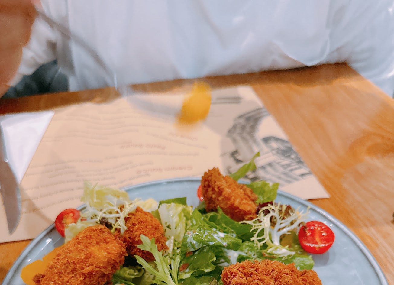 炸牡蠣好吃、沙拉配料很不錯 醬有微微的芥末味 很讚