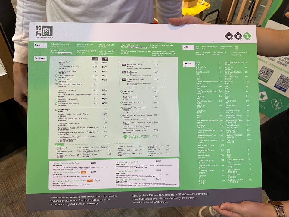 1.餐點等超久,到上湯底為止大概快30分鐘。先來了菜盤,一直跟菜盤乾瞪眼⋯湯底又等很久才上,肉又等了差不多15分鐘才來。6:30入場竟然吃到8:30才離場,有差不多一小時都在等菜來&等醬料補上杯子洗好,沒那樣的人力就不要貪心開二樓的座位。