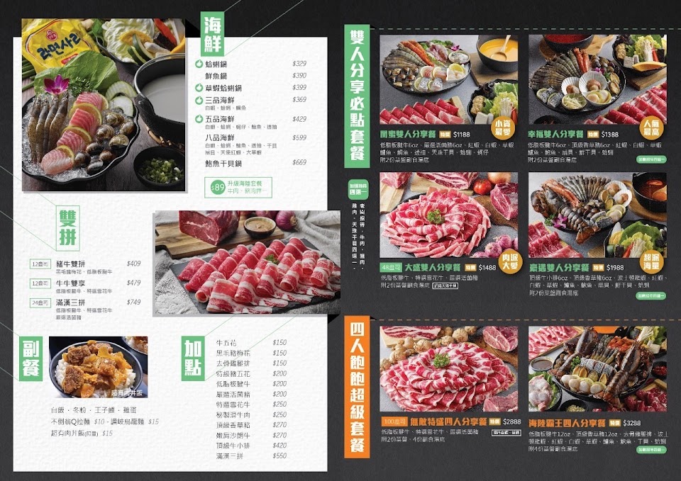 點了牛奶板腱牛肉和無骨雞腿排鍋和無敵海鮮鍋,牛奶味美味十足,牛肉也很多海鮮也很鮮美 服務 內用 餐點類型 晚餐 平均每人消費金額 $400-600