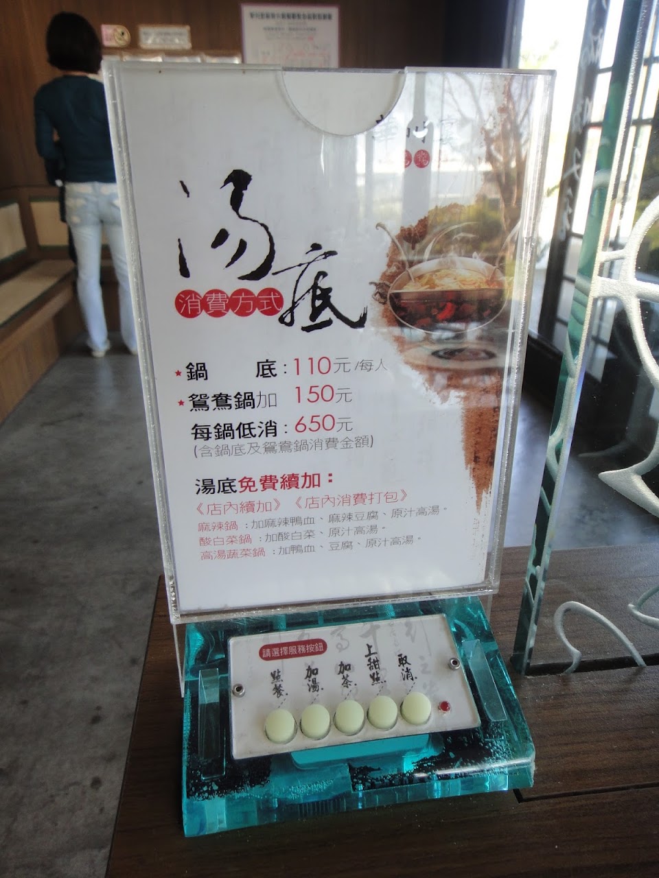 蘆竹華川宴是桃園市區少數的庭園餐廳, 麻辣鍋花椒香氣非常獨特, 麻味溫潤入口後在舌尖產生令人愉悅的香氣, 辣度適中, 不會過於嗆辣; 酸白菜鍋的湯頭甘甜, 山東大白菜發酵的剛剛好, 酸中帶點甜味, 非常棒地體驗. 雪花豬肉及牛肉切的很薄, 份量不多, 肉質較普通, 手工花枝丸還蠻好吃的, 但似乎與麻辣及酸白菜不太搭, 滷大腸加入麻辣鍋後味道很好. 但是要煮鰻久才會入味喔! 每個座位都有一個服務鈴, 可以隨時通知服務人員過來是很貼心地設計.