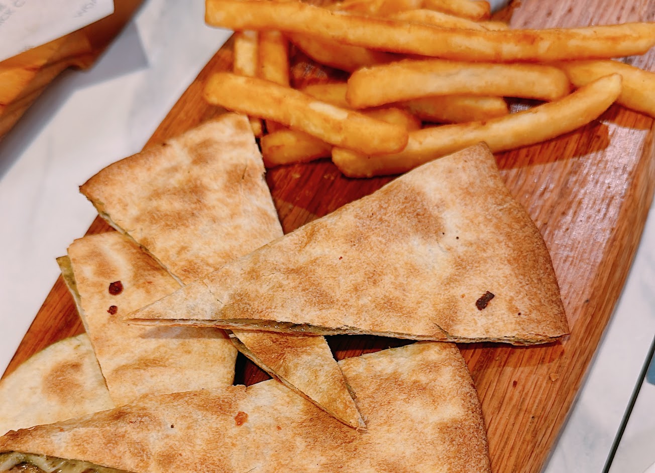 位在台茂三樓,這次點了奶油菠菜煙燻鮭魚蛤蜊義大利麵(@280)及西班牙海鮮烤飯(@350),另加點鳳梨柚香冰沙(@150)及一份附餐(@145含湯、飲料、法式生巧克力派)