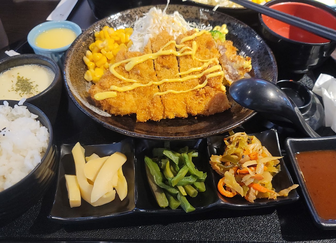 整體吃完覺得很好,豬排沾醬不錯,帶酸的味道是我喜歡的日式味道。小菜配的杏鮑菇跟筍片好吃,蒸蛋配著飯吃很搭,豬排好吃,炸雞有醃過的味道也好吃。推薦的一家店。