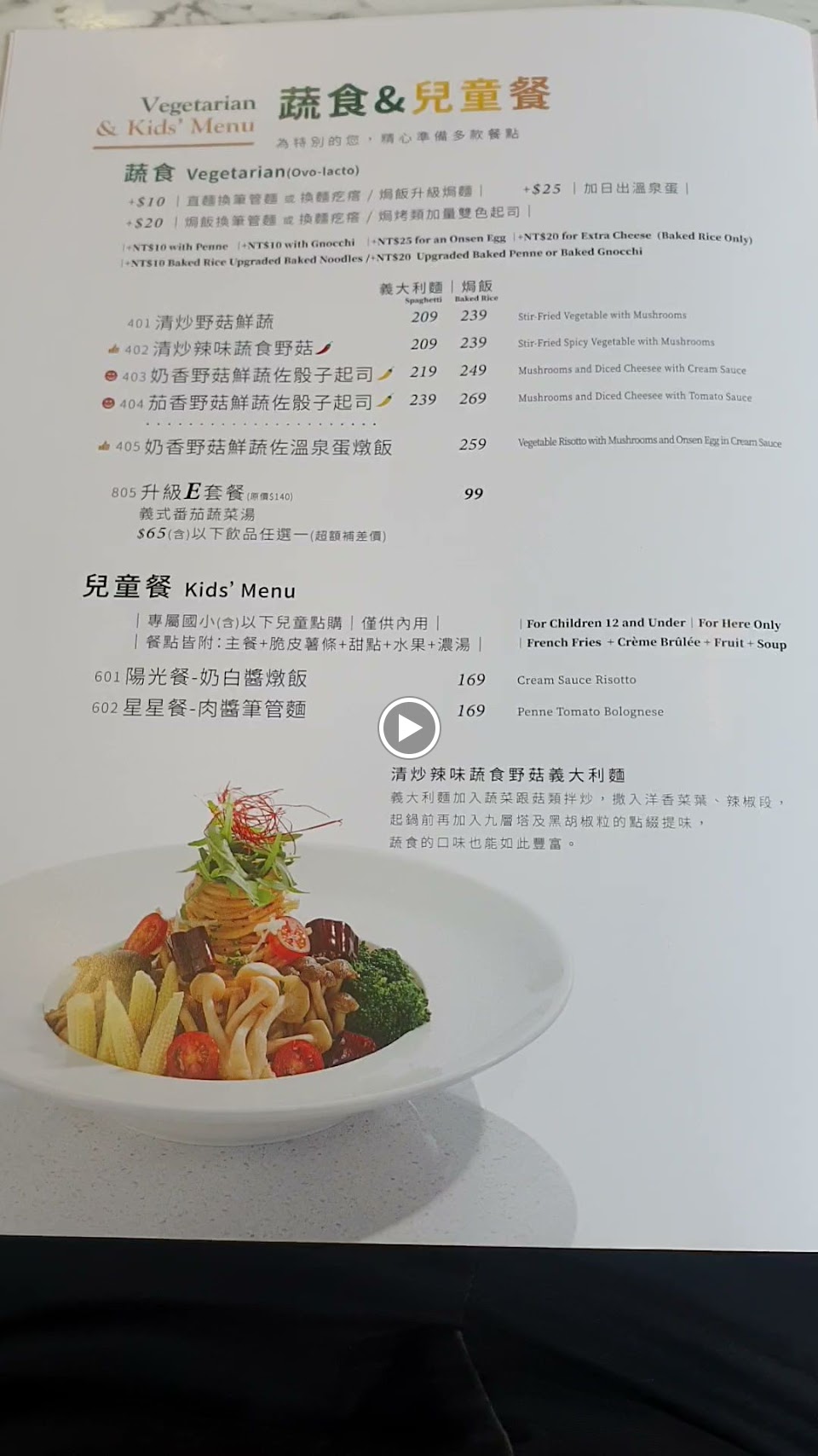 陽光兒童餐, 玉米濃湯, 匹薩薯條, 綜合義式千層披薩, 義式綜合披薩, 脆薯 甜心布蕾, 菇菇雞肉焗飯, 青醬雞肉佐起司粒麵, 經典海鮮焗飯, 甜點 烤布蕾