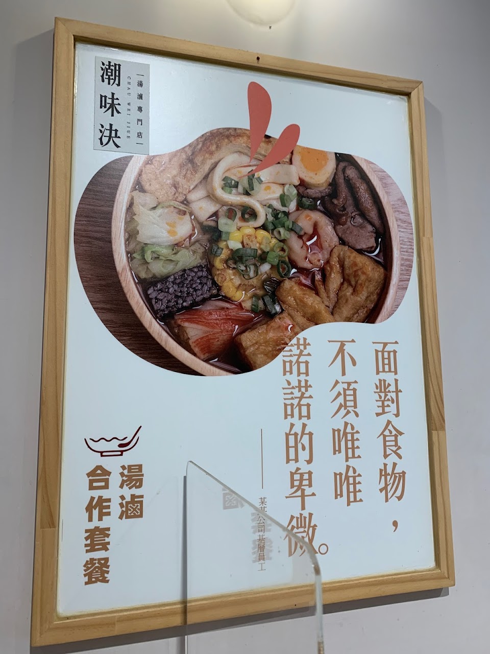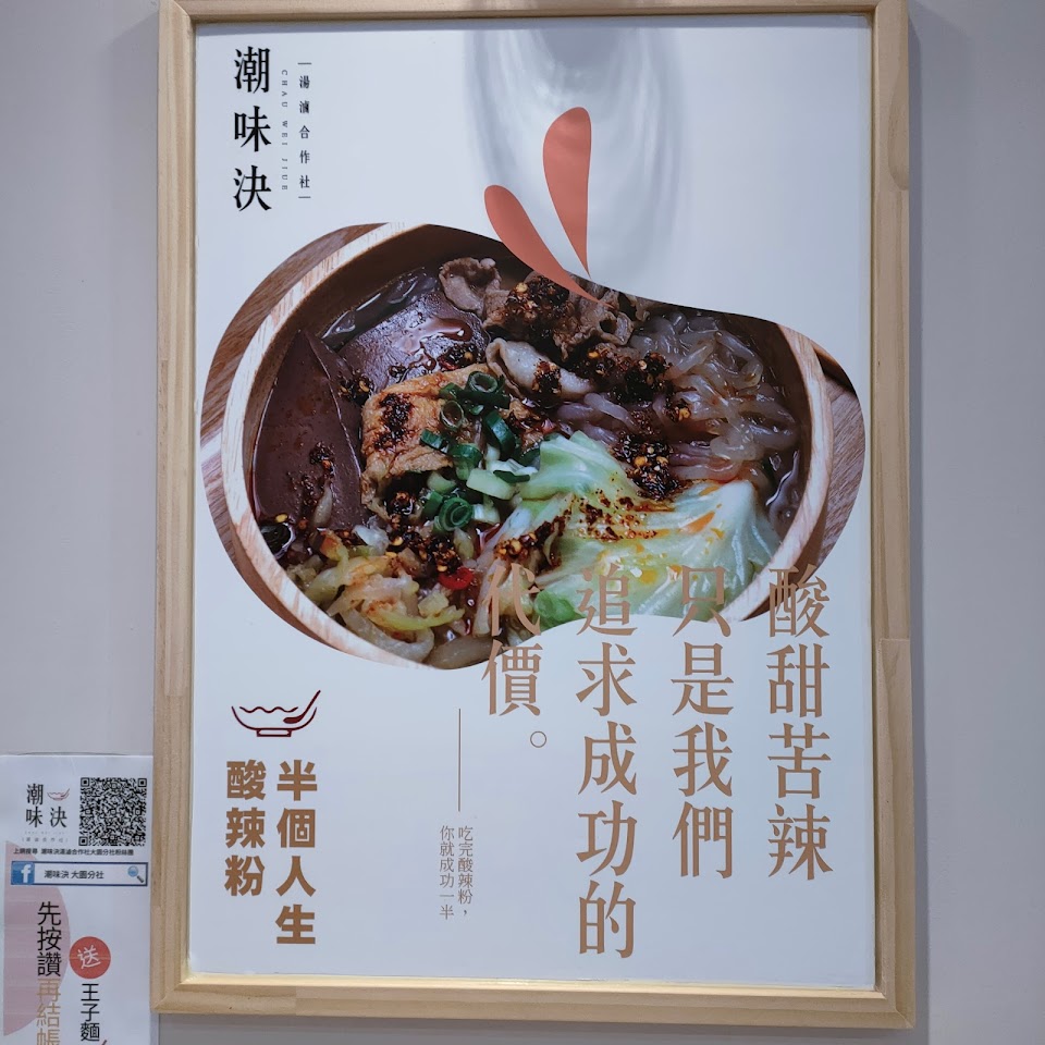 昨天中午在桃園大園市區覓食,不知道好多店都沒開??不經意看見這間「潮味決」,受到旁邊朋友推薦,決定來試試?店家外觀相當明亮整齊,內部裝潢似乎走文青路線,說是一間滷味店還不如說它是一間餐廳,因為用餐環境實在太舒適了? 查看菜單上的說明,可以了解店家的點餐順序,當下對湯類比較感興趣,可從7種湯頭挑出最愛:麻油遇薑黃、藥膳是經典、咖哩遇到湯、麻辣當招牌、豚骨味最鮮、韓式辛辣湯、義式紅番茄、金沙鹹蛋黃。邊享用美食邊觀看著牆面上有趣的標語海報,也是挺不錯的? 服務 內用 餐點類型 午餐 平均每人消費金額 $200-400
