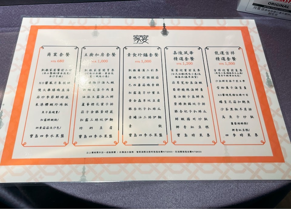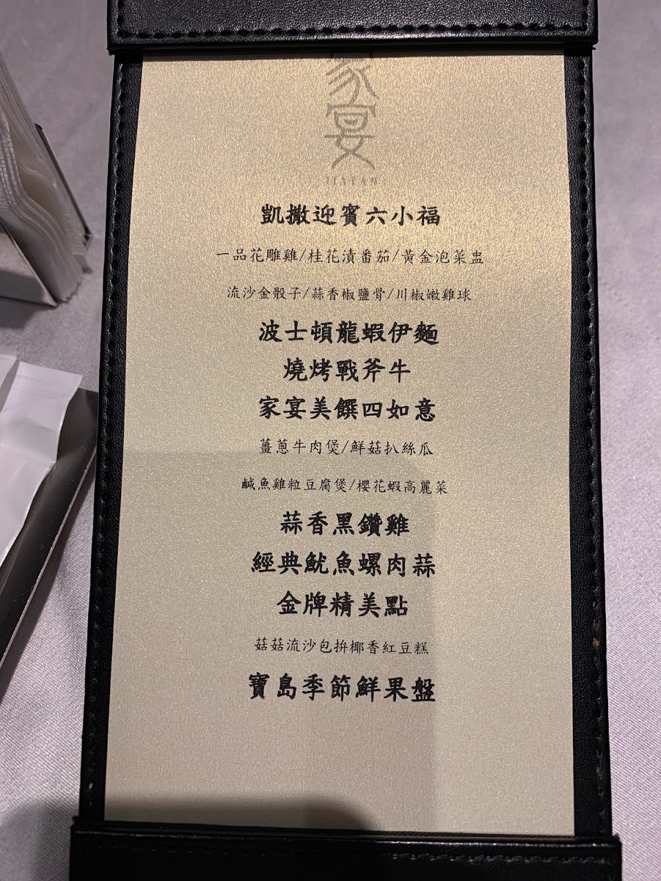 沒點到桌菜菜色普普,上桌大多溫溫的,份量偏少,如果說少份量是為了走精緻路線那口味也還不足,黑鑽雞半隻像1/4,炒麵也軟糊份量完全不像3-4人份,覺得可以改善的更好一些。吃過凱達家宴印象很不錯,但感覺板橋家宴口味不如預期,有點失望了。