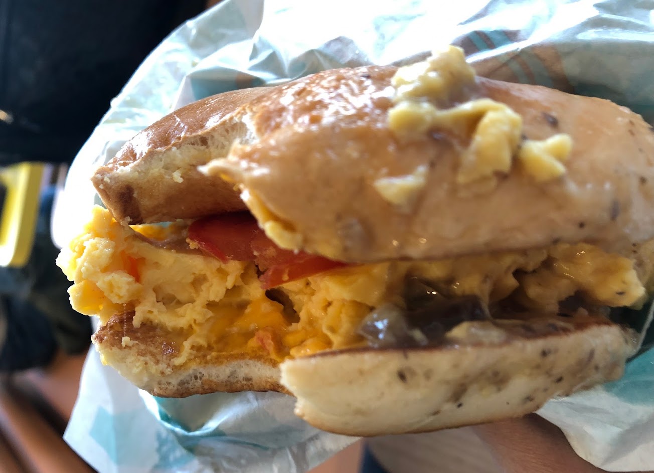 蕈菇起士嫩蛋焙果堡,醬汁多,會流,吃的時候要小心。