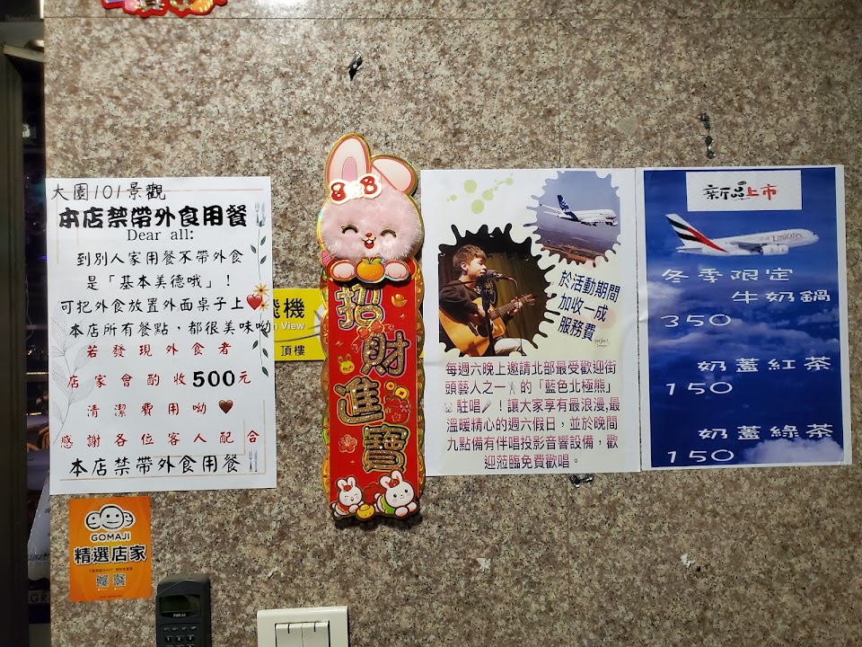 今日初訪大園101景觀咖啡廳,來之前有先看過谷狗評論每個來消費的客人感受都不同!晚上帶著一群家人來看飛機用餐 咖啡廳在寶雅隔壁大樓,電梯上去8樓雖然外觀有年代歷史感, 但進入室內很有氛圍感!戶外當飛機飛過轟隆隆可以看到飛機近在眼前的壯觀!我們一群人是星期六晚上前往,用餐期間 入入續續都有客人來消費.今日沒看到駐唱歌手,但老闆卻告知我們可以拿起麥克風點個歡唱,於是我們點了好幾首歌歡唱意外的像是來到KTV只是唱歌會有很多客人在聽,只要你不尷尬尷尬的就是別人,整體而言對我們一群人大大小小來說能感覺到開心,而且老闆跟闆娘人很好還會出來跟我們互動,在此我們渡過愉快的夜晚!享受到觀看飛機又能在此歡唱不知不覺度過了4~5個鐘頭 對於此趟消費是愉快的!唯一就廁所的部分 比較昏暗 可能清潔跟燈光需要改進一下囉!