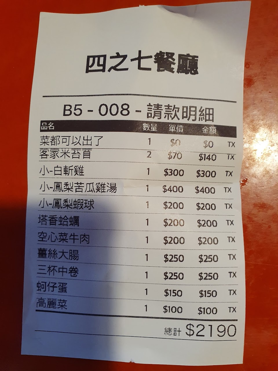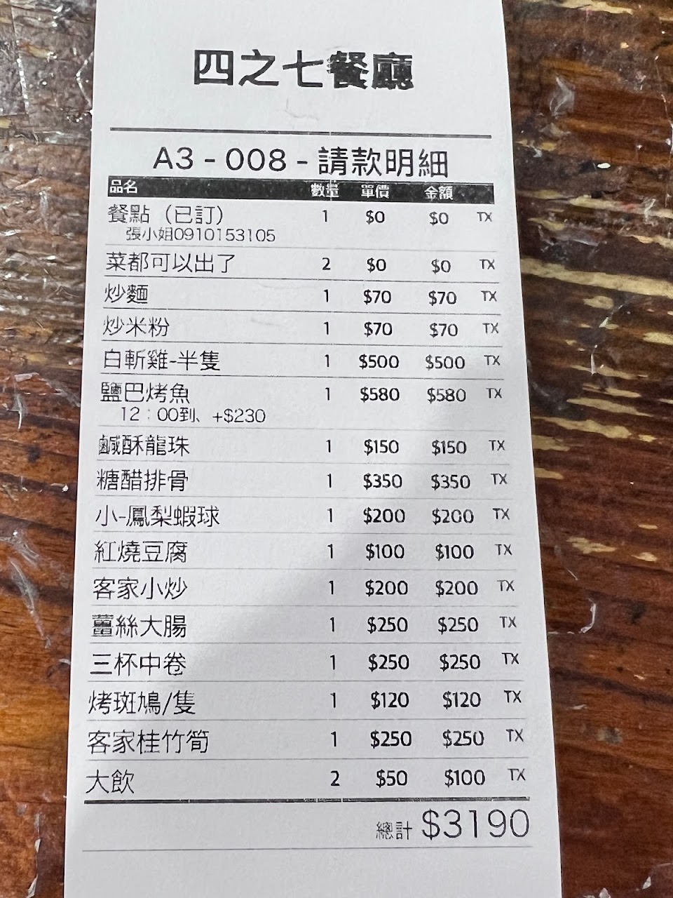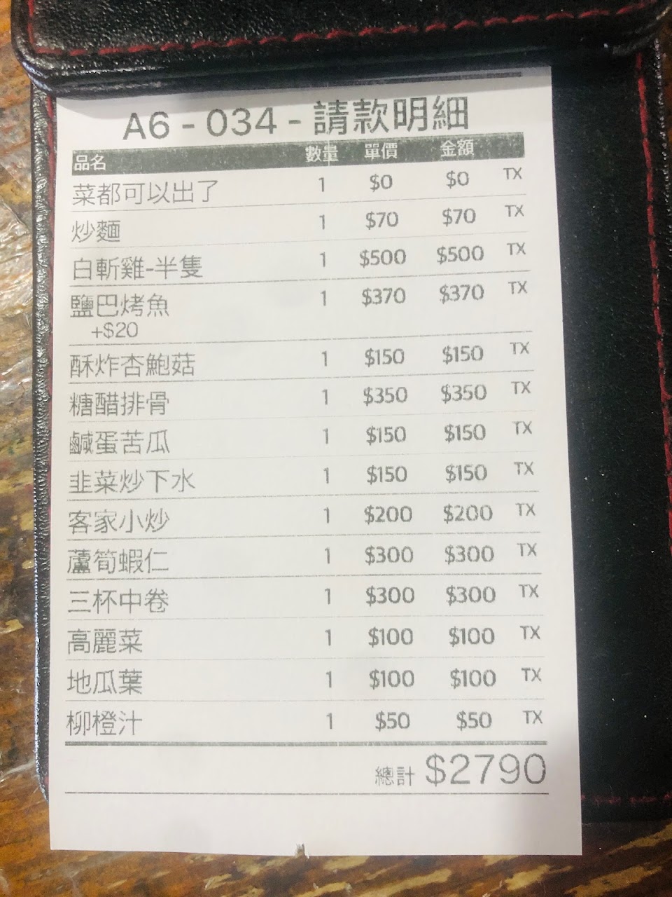 4000元合菜偏貴!麵線蝦是用蝦漿尾巴放蝦尾組合的樣子,外面裹麵線下去炸,吃不到完整ㄧ隻蝦的口感!老菜脯烏骨雞湯,老菜脯味道偏淡,感覺是一大鍋熬煮老菜脯,再分裝加了水用成一鍋的烏骨雞湯,裡面沒幾小塊的老菜脯!清蒸小卷,沒什麼味道,我們把五味糖醋魚改鹽烤魚,沒烤熟就上桌,後來有補烤另一隻給我們,我們也再點一隻糖醋魚,但味道還好,只不過確實炸的外酥內軟,尚可!和風松板豬,醬汁太鹹!蛤蠣檜絲瓜還蠻清甜的!其它客家米苔目,白斬土雞肉,紅燒檜虎掌,脆梅蘆筍沙拉也ㄧ般般!建議不要用合菜預訂,反而是現場單點的菜色較多樣選擇也較實惠!以上個人的飯後感想!