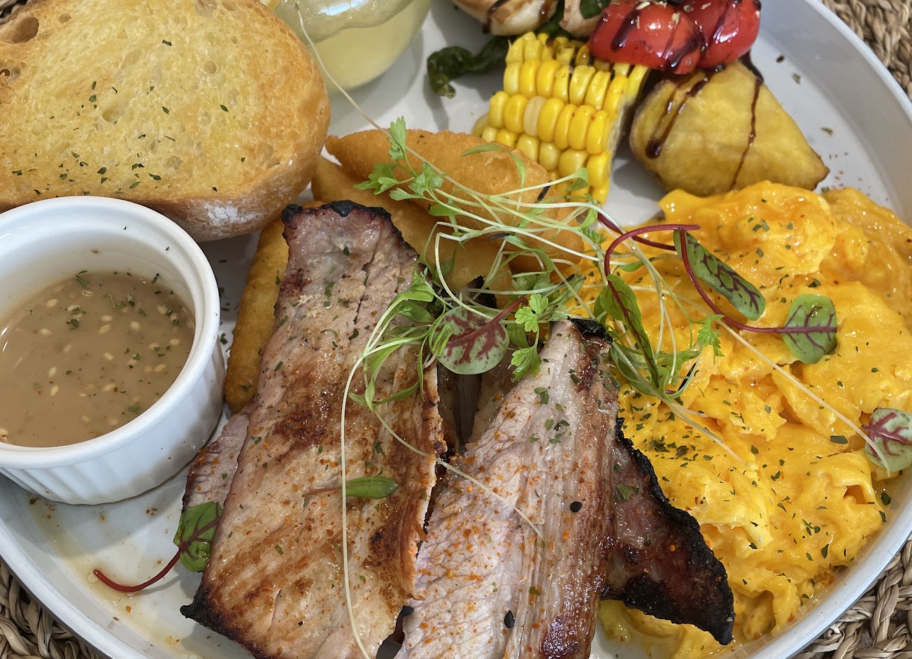 個人餐點:鹽麴霜醬豬佐胡麻味味增醬/加購主廚濃湯(今日是蕈菇濃湯)/附餐熱紅茶。豬肉軟嫩調味適中,份量足,沾胡麻味味增醬又是另一層次美味。美式炒蛋香軟可口。青醬巧巴達酥脆好吃。小農沙拉不冰冷也非美生菜,還有些碎小水果拌上柚香油醋醬,很合個人喜好口味。三角薯餅也炸得剛好,油有瀝乾。一小杯穀物優格,不太酸助消化。最意外的是端上桌的熱紅茶很顯高級感,綿密的白色泡沫很美好療癒,擺上一小塊檸檬果乾,紅茶帶點淡淡檸檬味,很順口好喝。蕈菇濃湯溫熱適中,幾滴橄欖油更佳提味。