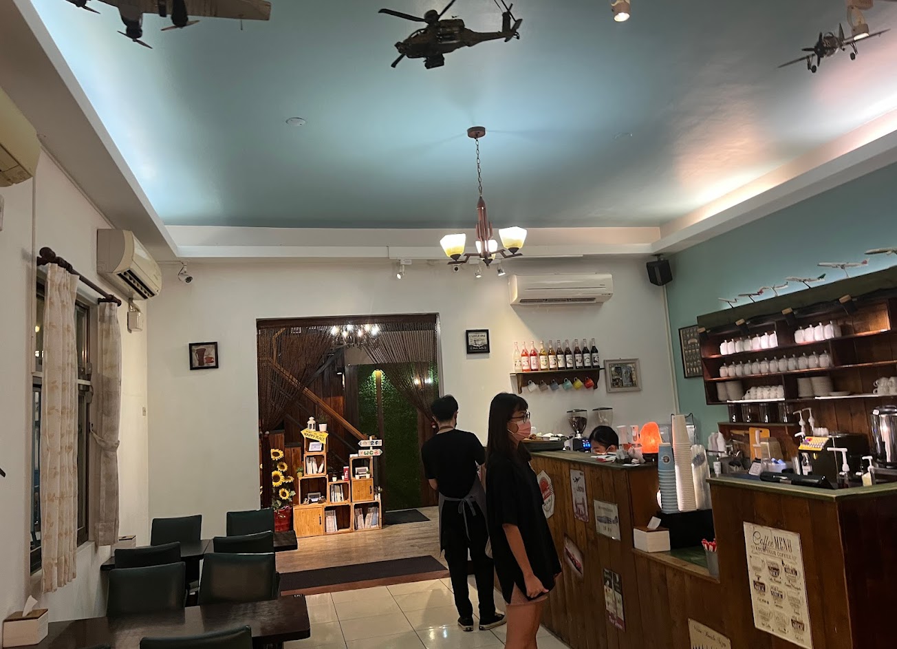 想不到疫情時刻,國門的飛機還是相當多,時不時也就從頭上飛過去一架飛機手機都來不及拿出來拍攝,當天週末人潮滿滿,就是風太大了吹到都要變傻子了,餐點就算是觀光區的,當天點了榛果拿鐵,蜂蜜柚子茶,柳橙汁,薯條,應該算柳橙汁比較失望,偏水一點,柚子茶還可以回沖但第二次味道就淡很多了,整體來說到還在水平之上,很適合踩點的咖啡廳,畢竟要體驗飛機低空飛過的震撼感這裡可能是首選囉!櫃檯旁邊還有許多飛機模型的展示可能對一些飛機迷會有極大的興趣,也很適合一探究竟喔!