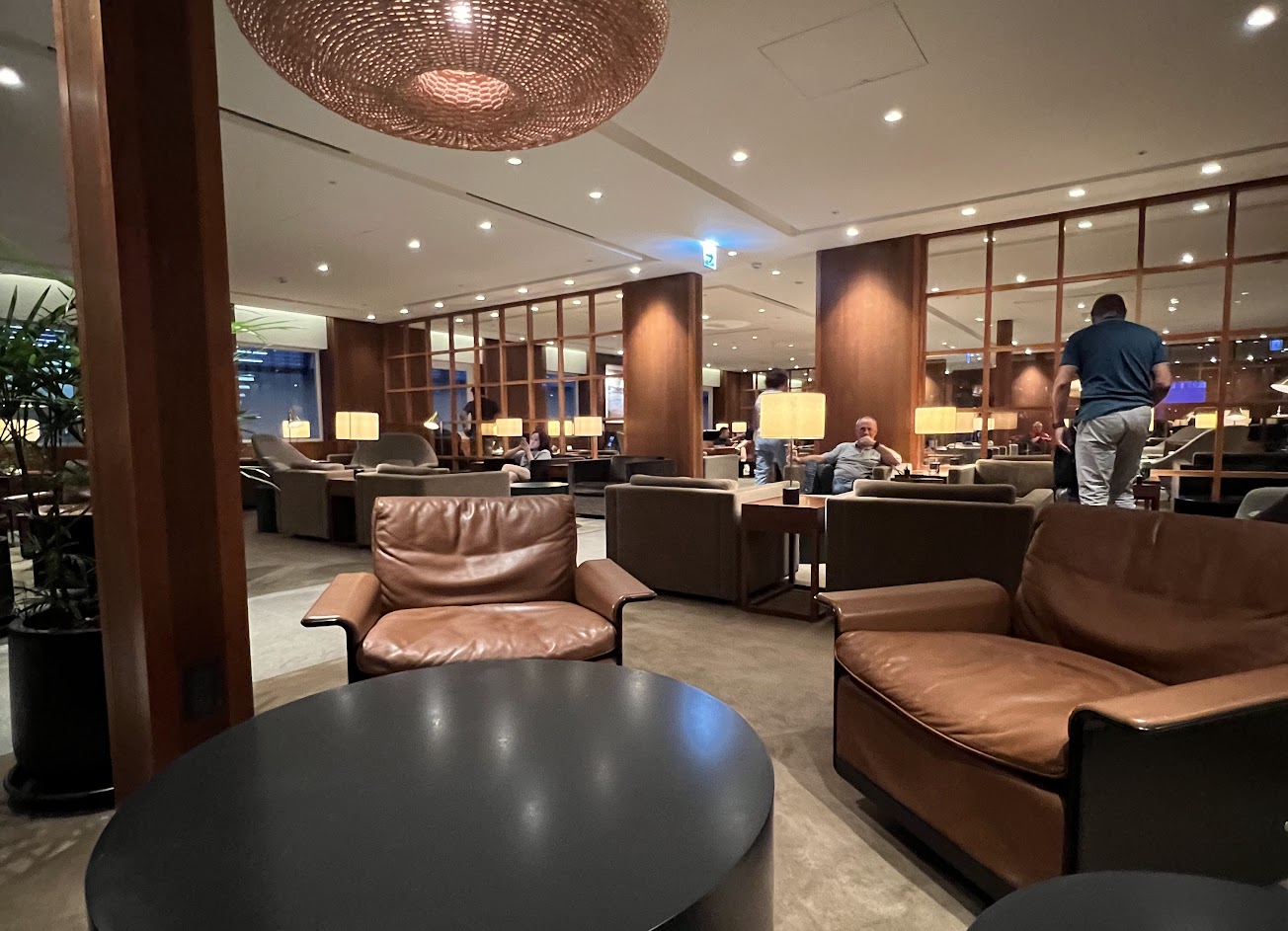 空間寬敞、飲品和食物的選擇多樣。寰宇一家聯盟藍寶石以上的會員持同聯盟的登機證皆可使用該貴賓室。酒吧10:00之後才有調酒師服務,餐點吧台的現煮牛肉麵要11:00之後才提供。貴賓室內有蘋果電腦可使用,貴賓室有獨立的洗手間。