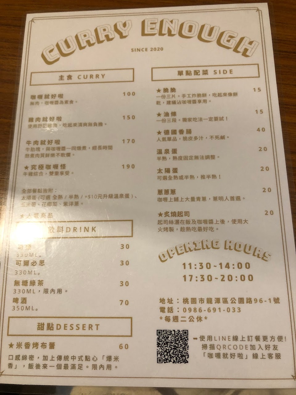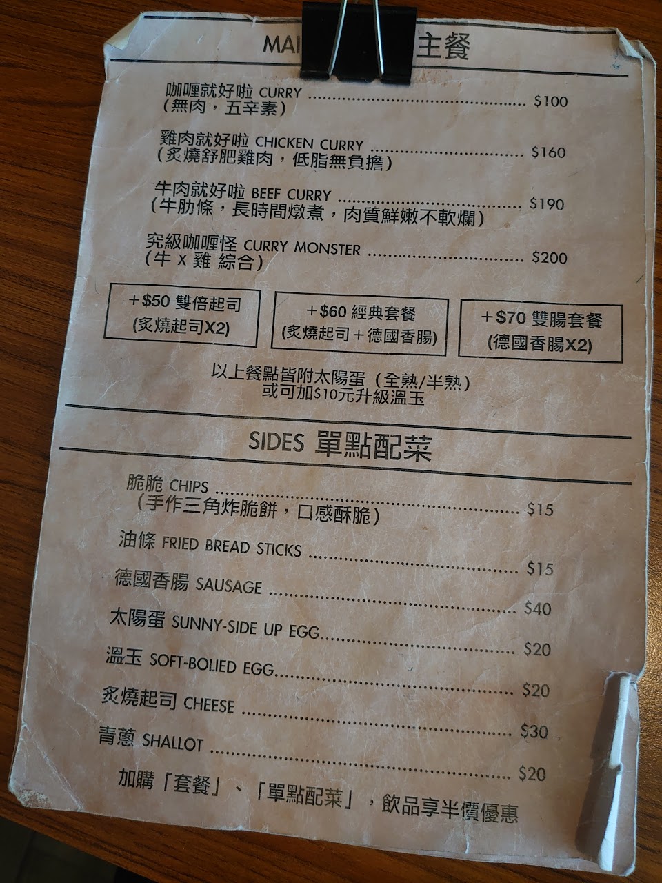 經典特餐會有炙燒的起司和德式香腸一根。等候的時候就可以聞到炙燒的焦香味,和咖哩的香味。咖哩顏色偏黑,吃起來有點提味的辣感和香料味,搭配起司吃起來會讓口感帶上一點滑順的層次。飯吃起來像米心沒透的口感,需要細嚼慢嚥。偶爾吃到切丁的馬鈴薯也會增加口感上的變化。德式香腸的部分很好吃,不會咬到肥肉或筋的部分,另外咖哩還會附上一顆蛋,可選擇全熟或半熟。 服務 內用 餐點類型 午餐 平均每人消費金額 $1-200 餐點:5 服務:5 氣氛:5