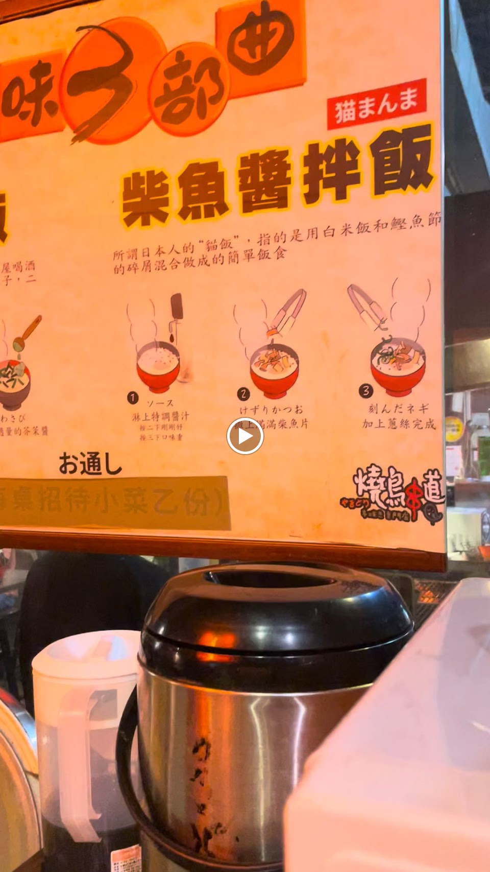 店家獨特燒烤醬汁層次豐富,蔬菜類沒有烤焦,肉類就烤得太硬,店內有白飯免費供應,可依個人喜好調成茶泡飯或醬泡飯,沒有提供水或茶,所有飲品皆需付費。