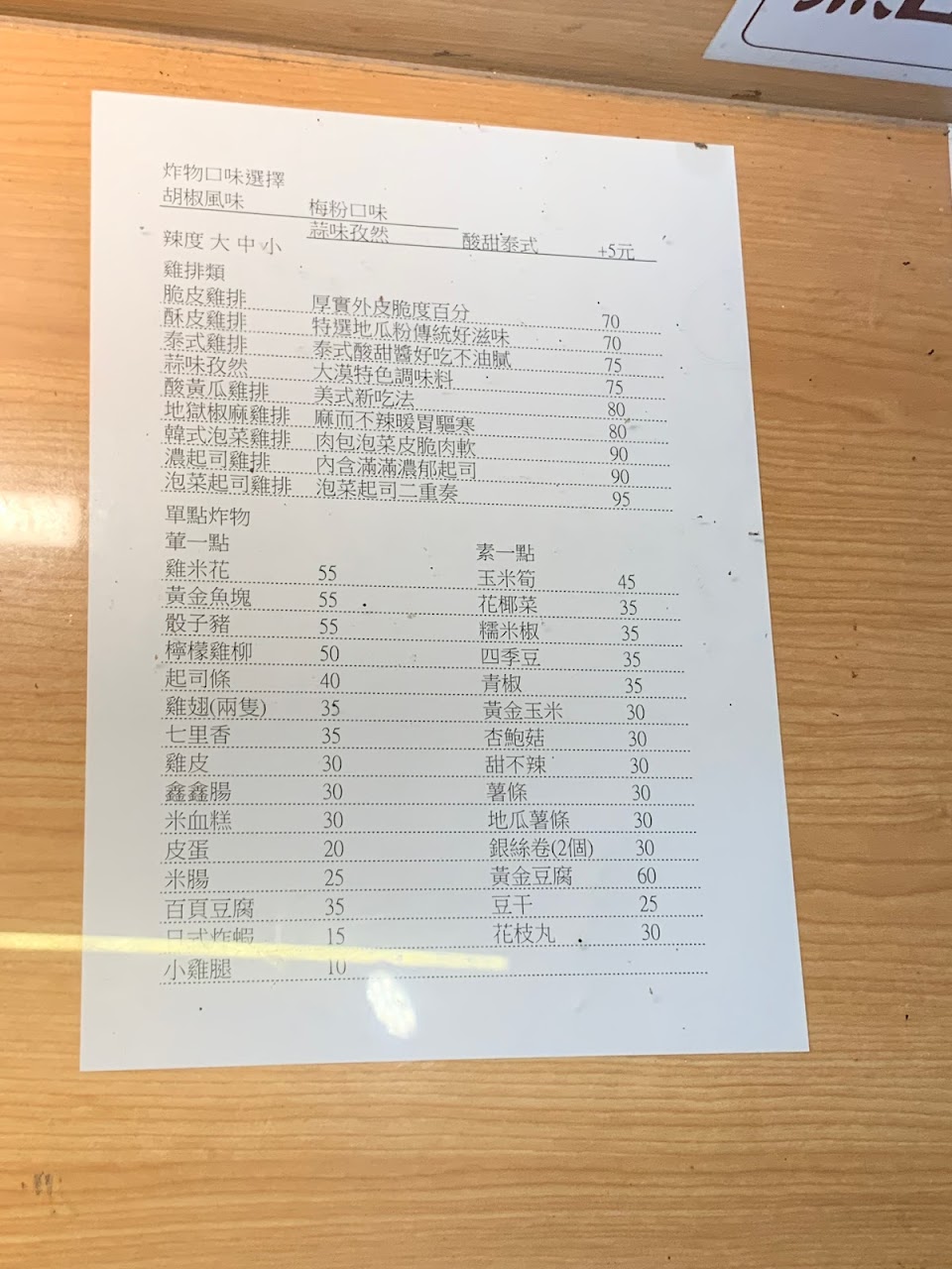 脆皮雞排真的超級酥脆! 絕對值得給五顆星! 可是炒炸物有點失望? 跟想像中的不太一樣,先炸後炒,但最後吃起來都濕濕的,看前一組客人是用紙盒裝,不曉得為什麼我的是用紙袋(或許點太少?!)甜不辣、皮蛋、七里香、玉米筍,全部都變的濕濕的,吃起來也很油,口感不太好沒辦法吃完。 但甜不辣跟玉米筍老闆也是很大方,份量很足夠~ 因為沒吃過,所以在Google map上看菜單點,沒發現炒炸物的「蒜味孜然」要+20元? 所以評論附上新的菜單給大家參考,個人覺得+20元很沒必要,而且有點太貴了。 不過以雞排的表現,我覺得這些東西都用炸的一定超讚,不然就是點炒炸物要多點一些東西問老闆能不能裝盒。 訂的人不少,老闆只有一個人有點忙不過來,建議先電話訂購,可以等再下單,外送平台也有的樣子,很推雞排!