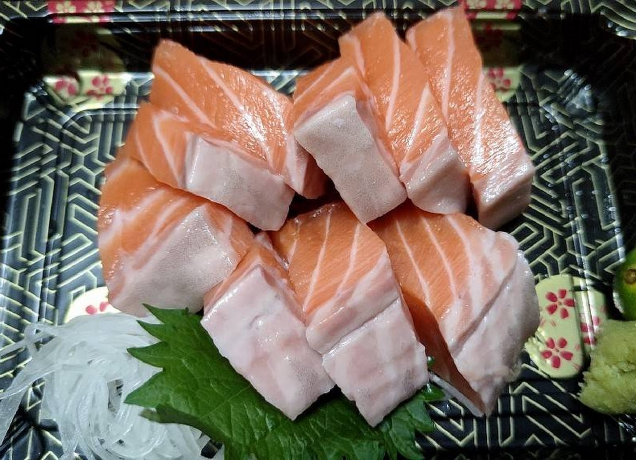 鮭魚生魚片超厚超好吃 外帶也是很新鮮 還會附冰袋保鮮 吃起來整個很鮮甜~