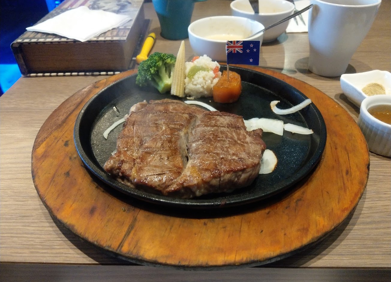 以下是細節: 母親節當天特地從臺北回家帶著家人用餐 兩人各點一份牛排 家母那份正常 但我點的肋眼Medium 上桌後熟度卻是BlueRare(即表面上色但切面9成以上面積為深紅色) 不論我切中或切邊都一樣 (並不是牛排厚度不均造成的受熱問題) 鐵盤再自然加熱頂多也只到接近MediumRare的程度 其實牛排一上桌光看表面顏色就知道了 稱不上褐色 部分還透著牛肉的紅色