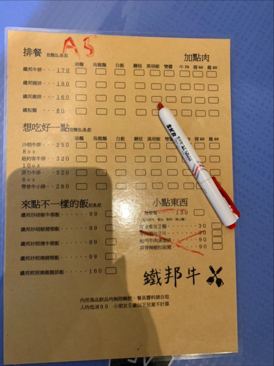 有夜市牛排的平價感,配料選擇非常多,油麵、通心粉、白飯等等滿不錯的因為不是很餓所以和朋友一起點一份「鐵邦豬+牛」是200多的樣子,有先詢問過可不可以共餐(年輕的店員態度很好,也同意我們這樣做),因為雙拼的關係,不喜歡盤子太擠而提出麵分開放的要求,當時年輕的店員也同意了!!!但後來年長的店員進來態度很差的和我說麵分開放就算是單點,一份只能放在一起(不能理解為什麼不行,但也沒關係就算了),一副就是在譴責我的行為??♀️可是我明明都有經過同意啊!!!!