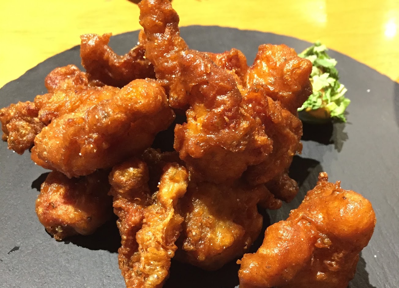 餐廳寬敞舒適、裝潢走溫馨路線,服務不錯! 餐廳有提供兩種水可飲用,氣泡跟非氣泡的礦泉水,這次兩個人來用餐,點了一道主食,其他都是開胃菜和餐酒菜,推薦炸雞、避風塘蟹、魚骨捲、干貝、海膽魚卵中卷義大利麵