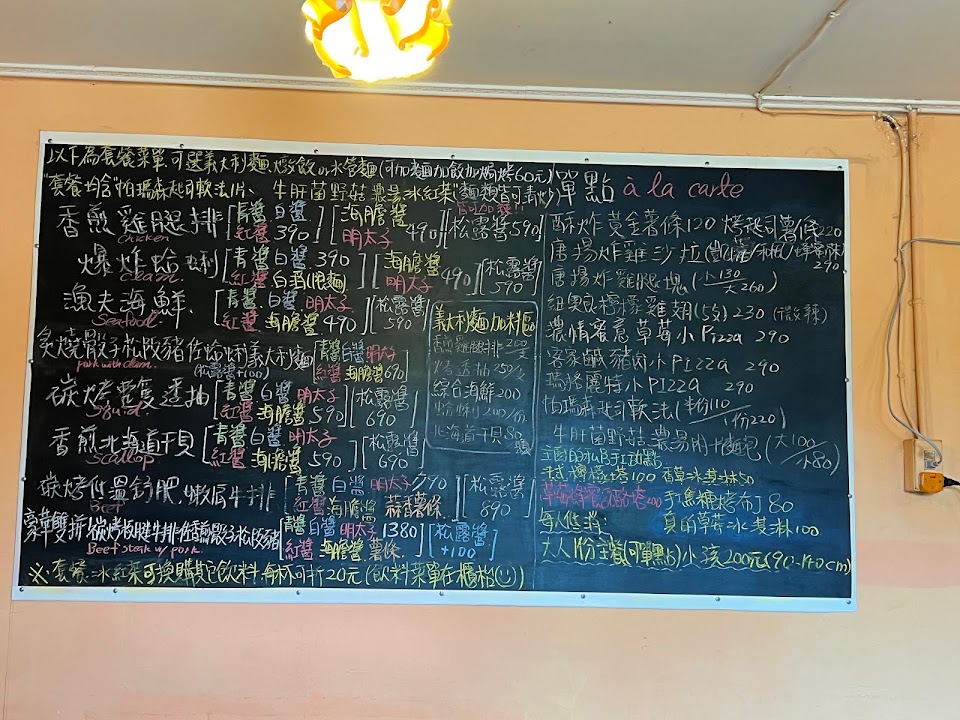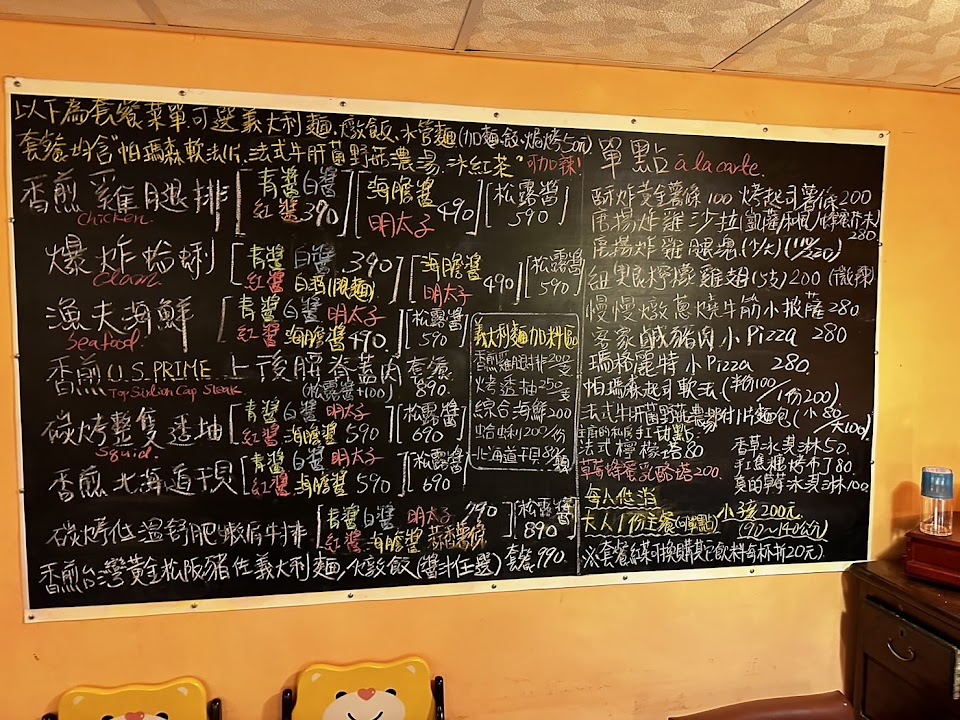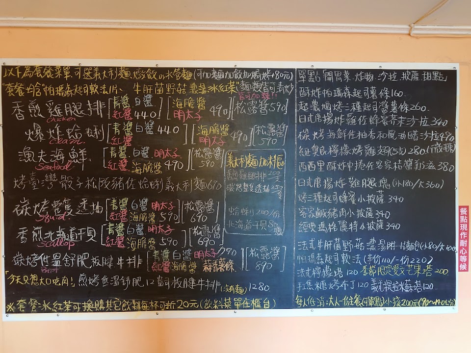 第一次到貴店消費 此店點餐方式特殊 是看黑板點餐方式 所以人多的話要記一下 店內裝潢有讓人回到家的溫馨的感覺和氣氛 此次點了炙燒骰子松板豬蛤蜊義大利麵690 or 漁夫海鮮490 兩分焗烤各加60 套餐各一杯紅茶 和 濃湯 麵包兩個 總共1370不收服務費總體還算可以