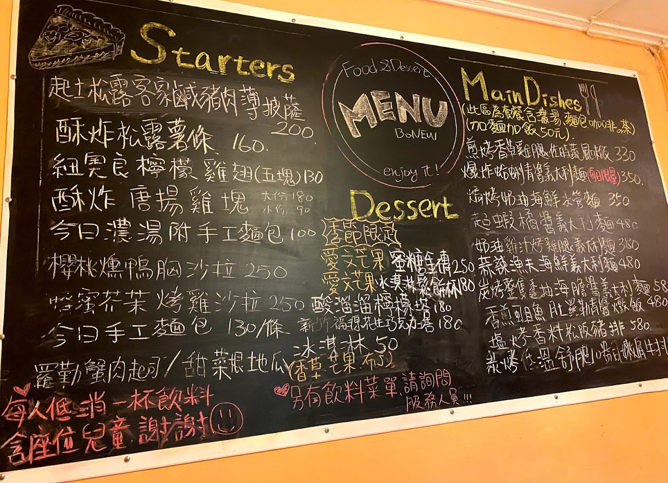 菜單很特別寫在黑板上,右半邊都是主餐附套餐的,包含湯品、麵包跟飲料(可以選咖啡或紅茶,可調整冰塊,飲料不會太甜),若要點其他飲料,可以和老闆拿飲料單。