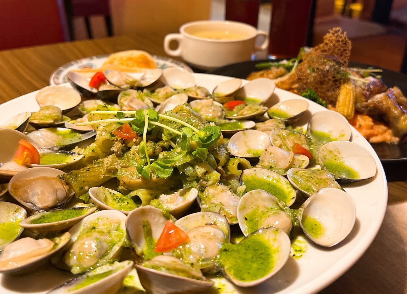 爆炸蛤蠣青醬義大利麵, 麵包 濃湯