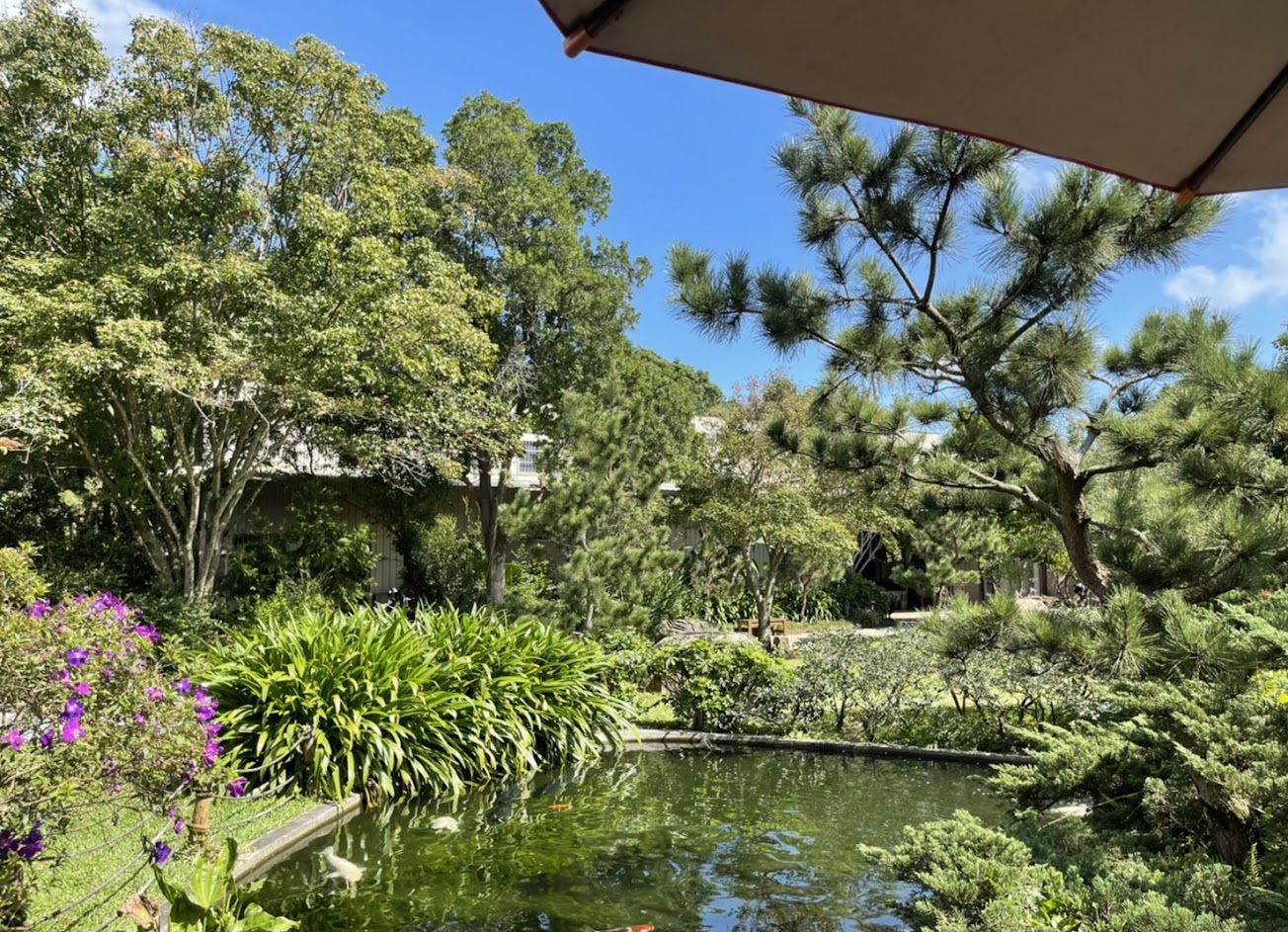 刻意選在週四非假日前往,結果人潮還是眾多,據說假日期間更是難訂到位,戶外停車場很大,戶外也設有庭院休憩座位,兩池的錦鯉池,飼養的非常巨大漂亮。