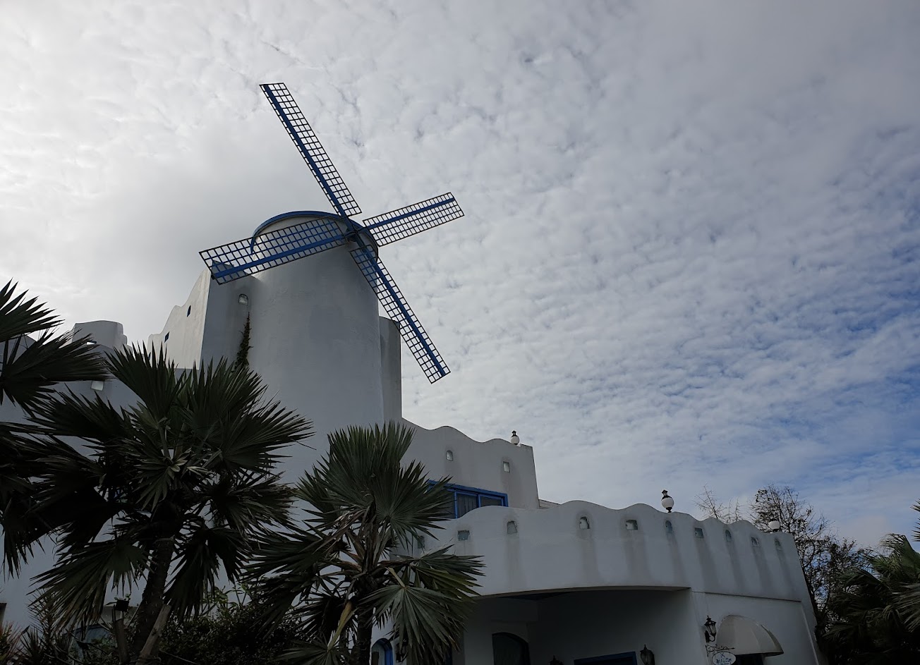 特色客家熱炒美食,藍色風車搭配白色建築,像是來到地中海希臘一般。