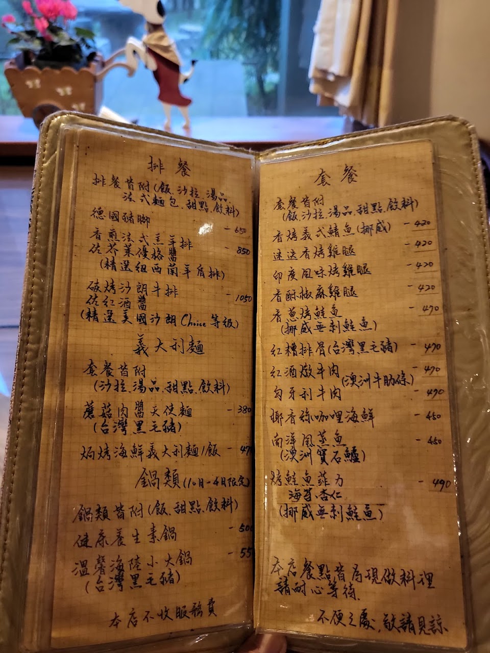一對夫妻開的餐廳,店內木雕藝術品都是老闆自己手作,菜單上的字也是老闆親筆,老闆多才多藝。