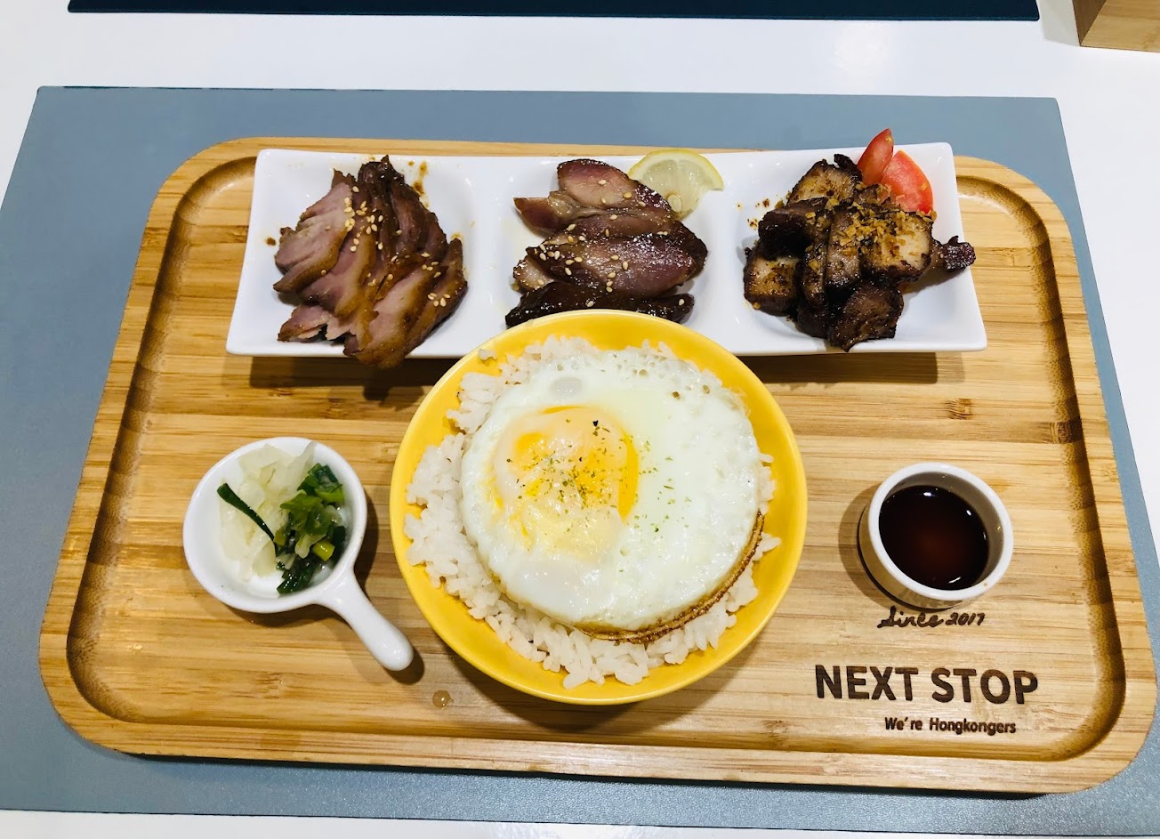 老闆是香港人,餐點都是很道地的香港餐食改良,明亮的黃白空間跟燈光佈置,讓餐廳多了一點溫馨感,必點招牌絲襪凍檸茶味道清爽跟檸檬香氣、絲襪奶茶茶香濃郁好好喝,餐點推薦叉燒三重奏(蜜汁叉燒、柚子蜜叉燒、花椒麻辣叉燒)跟豐盛滿滿盤,一盤有很多配菜