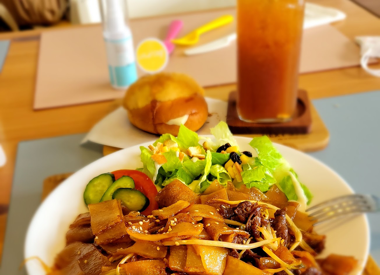 我自己點的是乾炒牛河,口味有稍微偏鹹,但鍋氣十足,讓人一口接一口吃光光,搭配清爽的沙拉和菠蘿包跟飲料,分量充足。