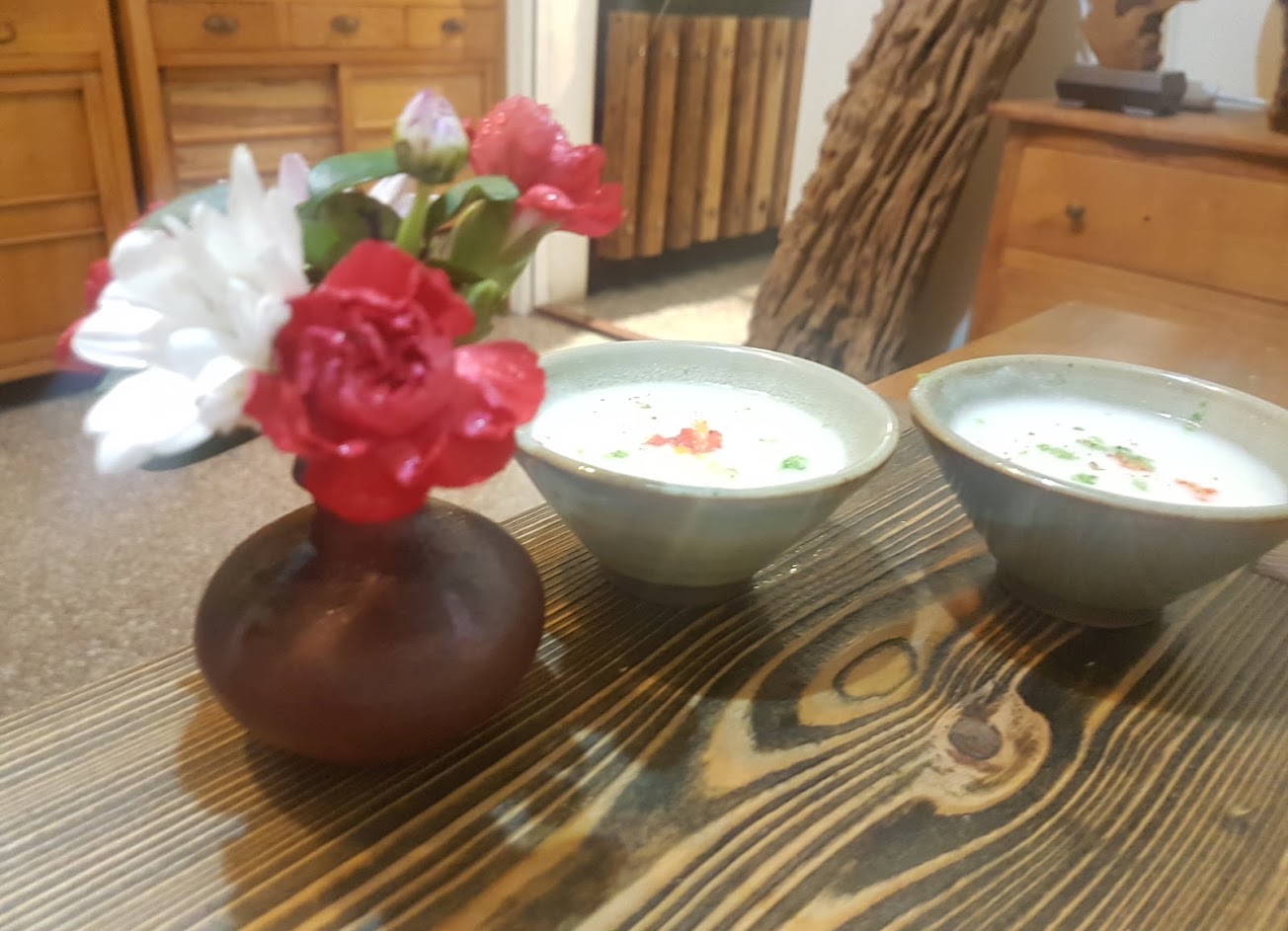 手工豆腐配伯爵花椰蘑菇湯很養生