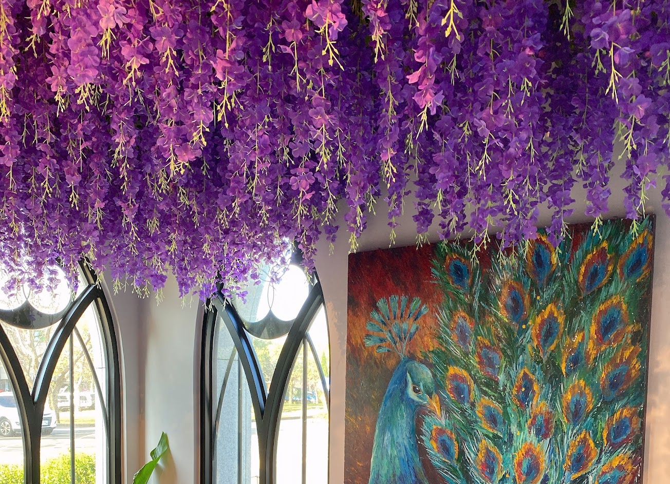 裡邊挑高的空間,靠裡面的一區天花枝掛了整面的花,真是有夠浪漫
