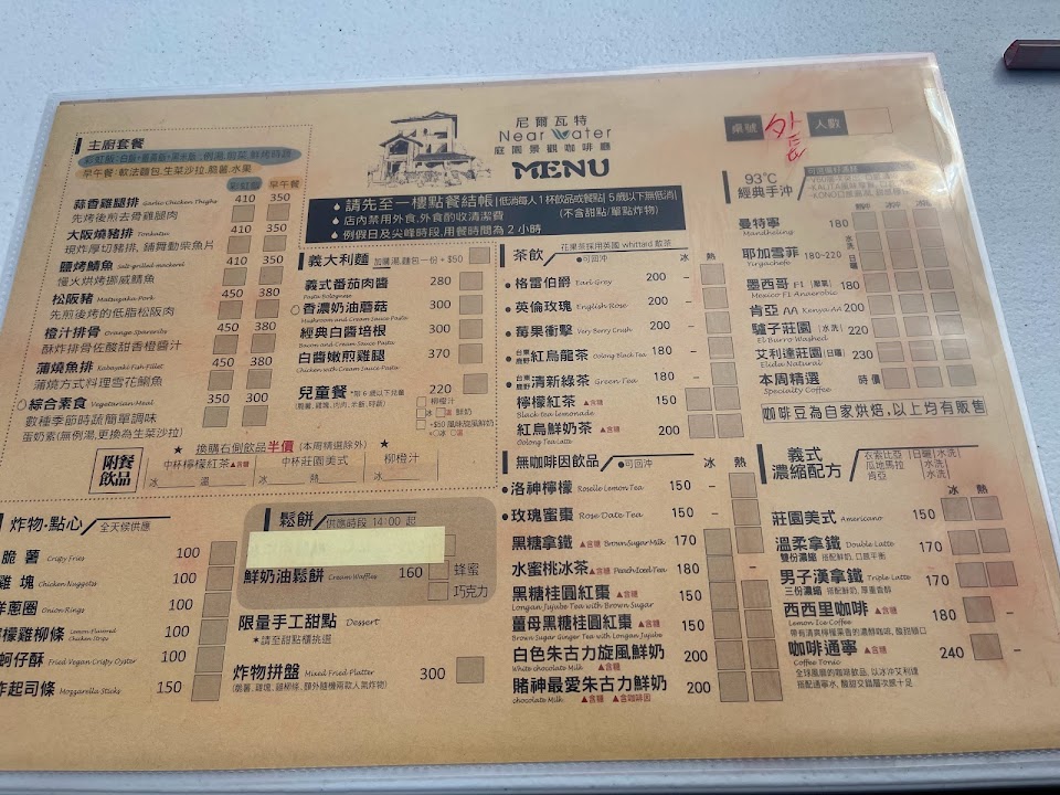 菜單有早午餐、飯食、義大利麵、甜點、鬆餅、手沖咖啡、義式咖啡、茶飲等,價位落在$100~$420之間