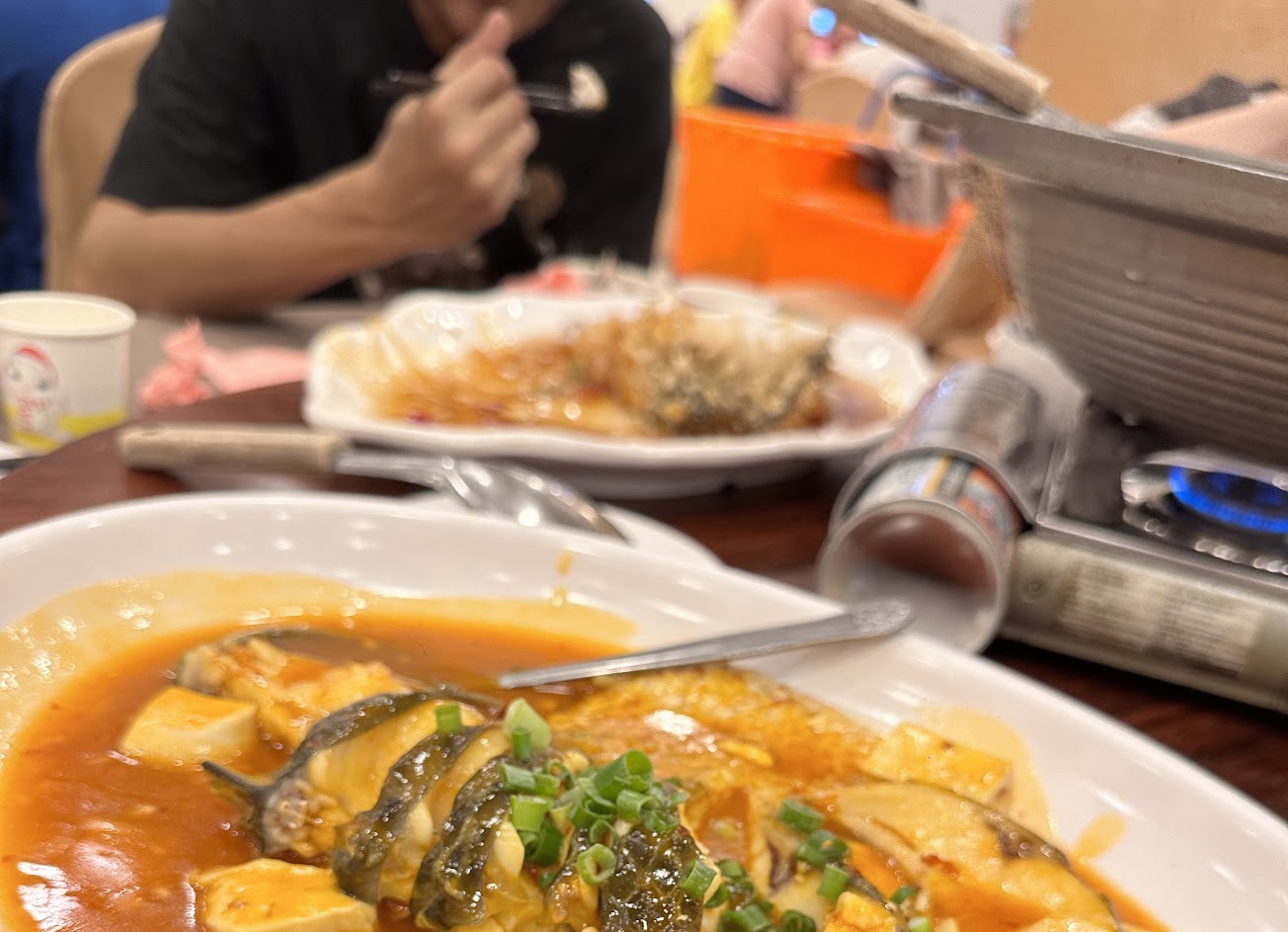 大型餐廳有包廂設計,服務人員訓練有素,客戶需求均能及時得到回應處理,菜色豐富,清蒸魚好吃,招牌米苔目湯頭略鹹,砂鍋魚頭湯頭不錯可加湯,豆瓣魚可能是部位的關係,小魚刺很多要小心吃,糖醋魚較酸(非一般番茄醬口味)要看個人喜好,脆皮油雞肉質是鬆鬆的,不是彈牙口感,銀絲卷沒有炸得很酥,煉乳花生粉也偏少,整體菜色沒有很出色的料理,但也ok沒有特別雷。上菜順序蠻奇特,前面上豆瓣魚清蒸魚只好叫白飯來配,炒飯炒麵銀絲卷在吃2/3左右才上,脆皮油雞最後上直接打包。倒是服務人員都親切有禮,這種大型餐廳常常會有漏東漏西的問題,能立刻解決客戶需求算很難得。