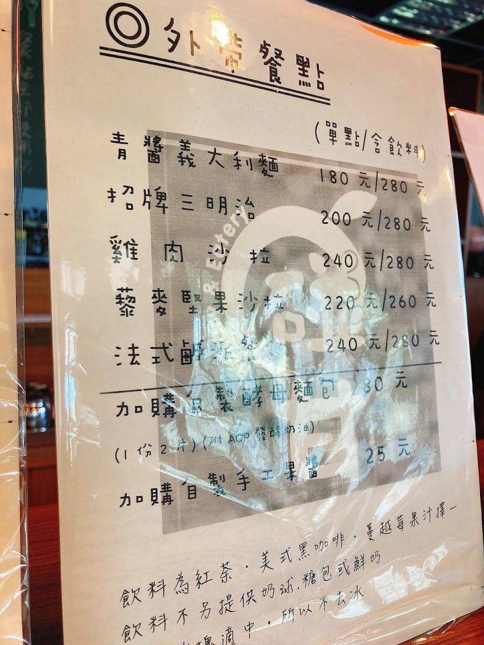 吃得出來是自發菌種,老闆走日系風格,所以麵包屬於軟調性,也是一種風味。鹹派好吃,但是餐具不對,取食有些狼狽!!建議刀叉搭配中型湯匙,會優雅些。沒有下午茶!!應該是說沒有組合為一個套餐,飲料與甜點分開計費的方式,讓人感覺商家就是來做生意而不是交朋友的。但是,老闆很客氣,餐廳也整理得非常乾淨,值得放心用餐。是一家可以有很多話題可談的店。