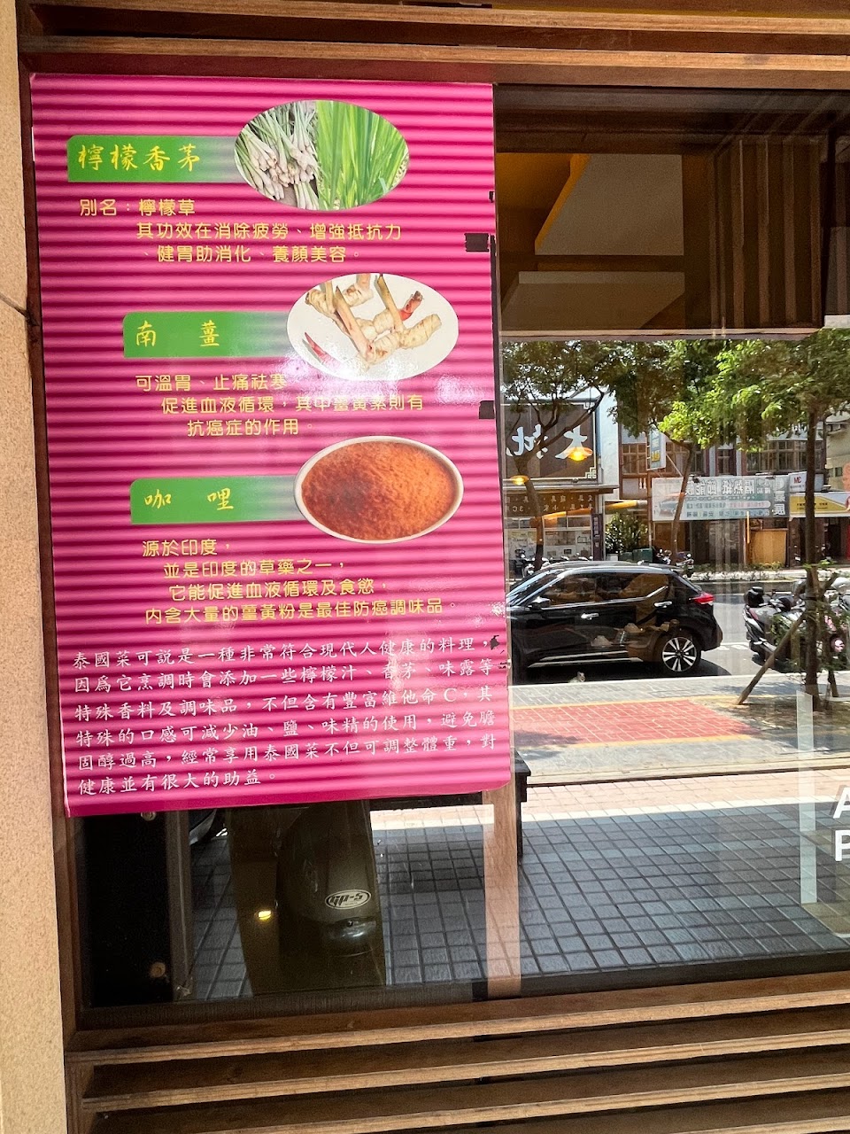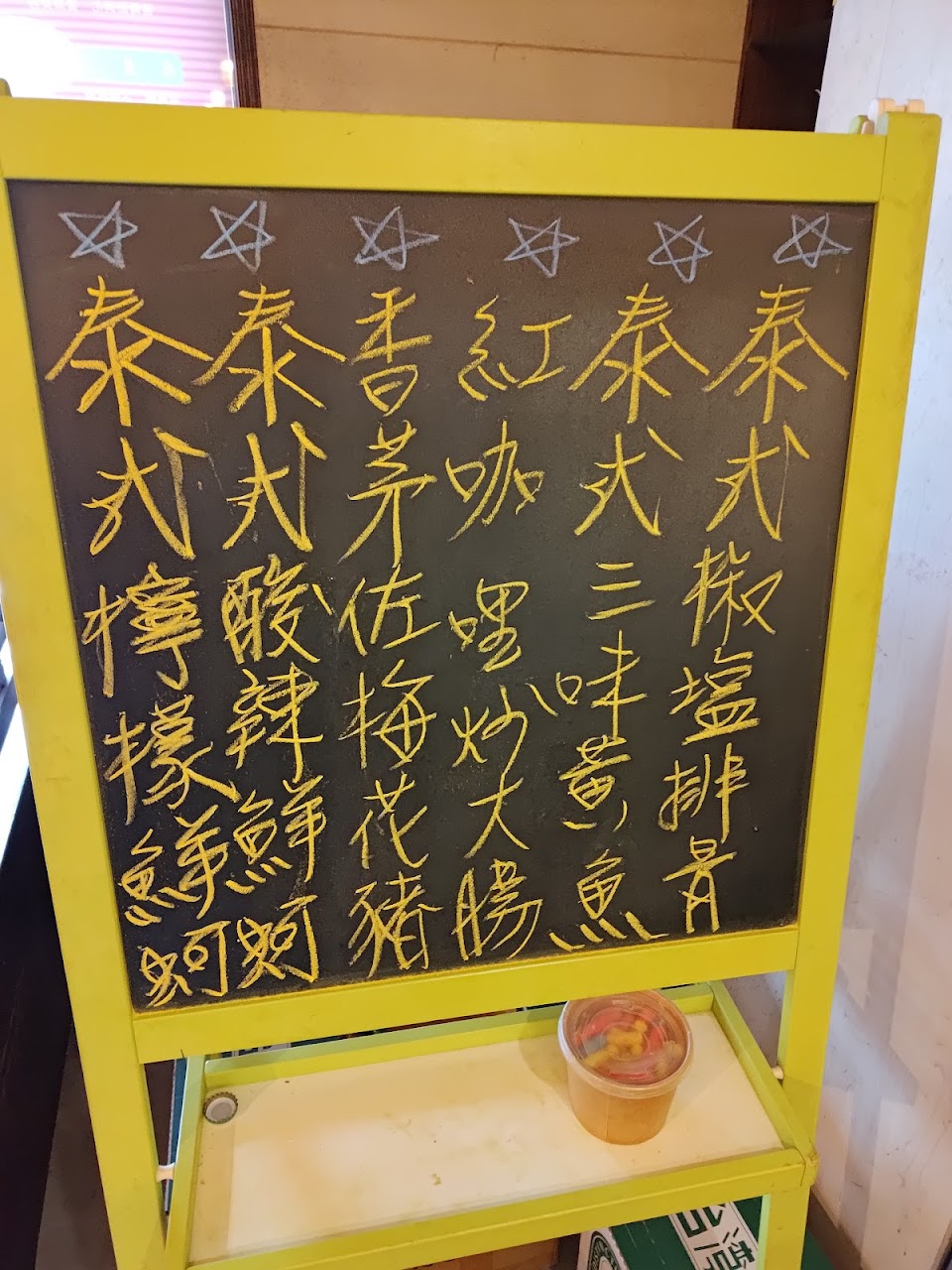 闆娘很熱情的介紹菜單跟餐點製作方式跟耗時多久,聽了每道都想點,餐點都蠻好吃的都是現做的手藝菜,蝦餅是配梅子醬沒吃到蝦塊.蠻脆的蝦餅,帕南咖喱牛份量偏少蠻喜歡這個咖哩醬有打包醬,皮蛋打拋豬蠻特別的整個下飯,咖喱蝦豆腐的豆腐好吃,黑板上闆娘推薦的點了椒鹽排骨比較乾硬是沒看過的菜,冰泰奶好喝不會太甜,椒麻雞是軟嫩的雞腿不是一般印象中炸的椒麻雞,依闆娘介紹餐點重醃製跟香料醬料有別一般泰式印象,比一般泰菜不辣,內用有解膩好喝的香茅茶,菜單名稱看似平常實際是不太常見的泰菜,會再訪試試其他菜