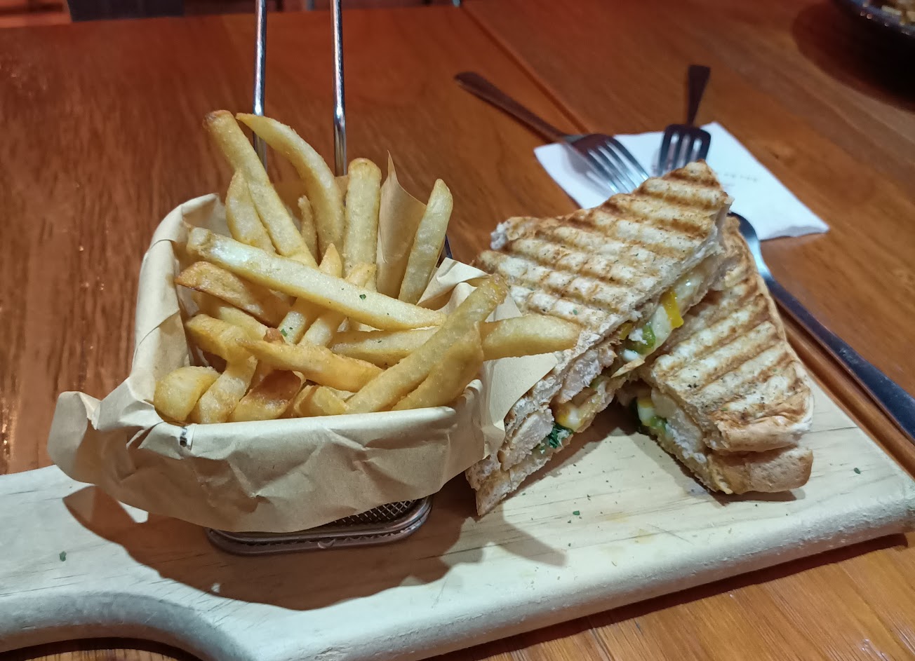 BBQ燒雞帕尼尼內料也不馬虎 醬燒雞肉大塊且非常入味跟起司搭配的剛剛好 熱壓吐司烤的咔茲咔茲