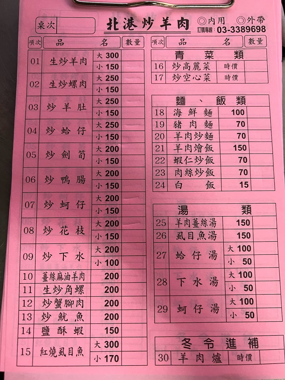 菜單上面都有標價格 ?生炒羊肉 小$150-羊肉滿多的 菜量也不少 不會太鹹 加了沙茶吃不太出來羊騷味 ?炒花枝 小$150-炒的非常有水準 加了醋調味 越吃越有味不會膩口 花枝很新鮮 ?羊肉燴飯 $150-飯量超多的 一個人吃一盤就會很飽 肉量跟菜量很足 但味道又跟生炒羊肉不太一樣 有點勾芡的感覺 滿好吃的 ?蛤仔湯 小$50-一致認為CP值很高 蛤蜊滿多的有很鮮 薑絲味很足 湯好喝