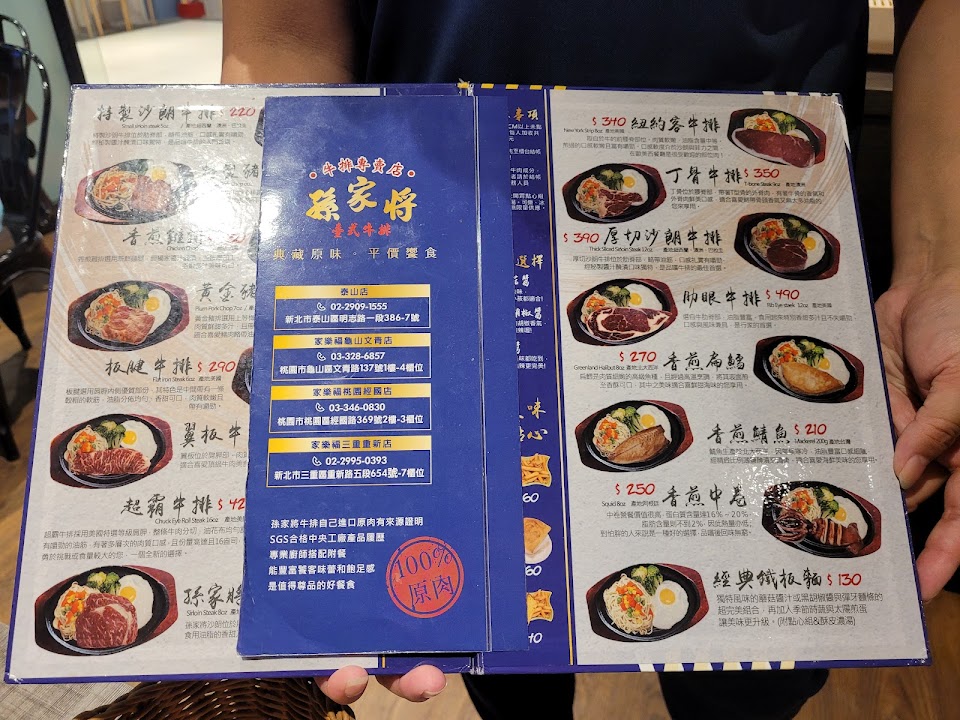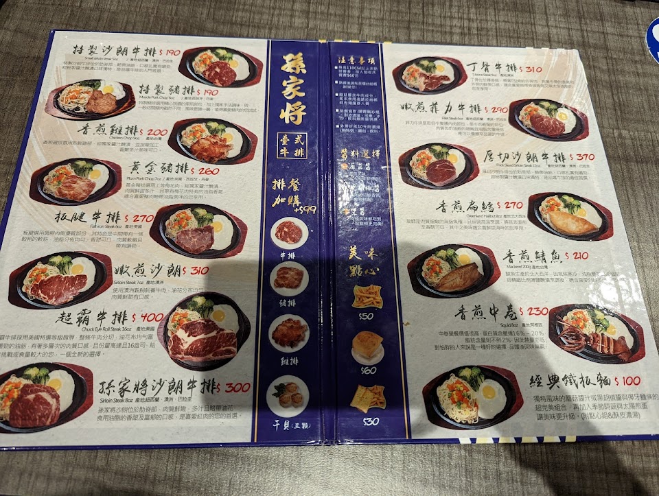 ·沙朗牛排 $220 五分熟肉塊,大小不小,肉質軟、肉汁豐富但有點韌,不是那麼好咬,麵條一般,有稀有的荷包蛋、花椰菜和三色豆。酥皮濃湯絕對加分,很酥香,搭配濃湯吃剛剛好,副餐還有吐司和薯條,無限供應的自助吧有咖啡、冷熱飲和冰沙。整體CP值高,用餐時段人潮超多,建議先來候位呦! 服務 內用 餐點類型 午餐 平均每人消費金額 $200-400 建議的餐點 孫家將沙朗牛排, 烤土司 薯條, 酥皮濃湯