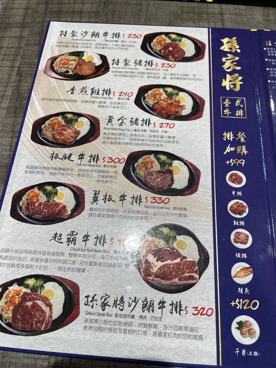 孫家將沙朗牛排, 烤土司 薯條, 酥皮濃湯, 板腱牛排 麵換菜