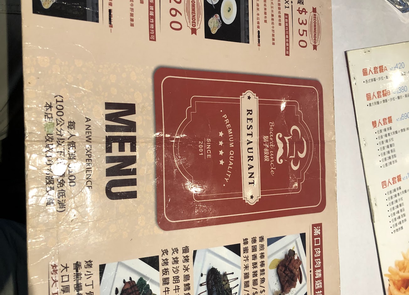 鬍子叔叔現在七周年慶!套餐第二件五折! 很喜歡吃丁骨牛小排!(圖一 還有優格醬的沙拉!也很清爽 比較可惜的是今天只剩下南瓜湯! 沒有機會選擇 但是也非常好喝! 奶酪五分的話給2.5分! (沒有不好吃但也沒有很好吃! 冬瓜檸檬可以請店家調酸一些!更好喝!