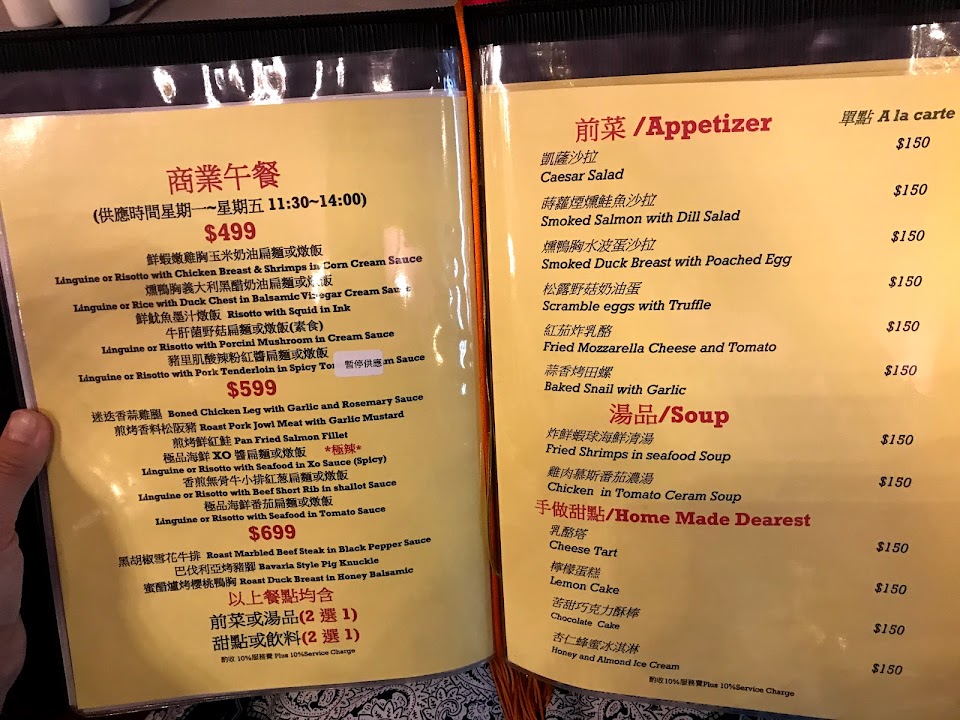 餐廳像是一般民宅改建,二樓有個小包廂。這天點的義大利麵和戰斧豬排味道都不錯,尤其推薦戰斧豬排,肉很厚實但烤得熟度恰到好處,咬下去肉汁噴發,且份量不小。如果套餐可以多一種只有麵包搭飲料的選項就好了,不然加套餐要四百多實在有點稍貴。
