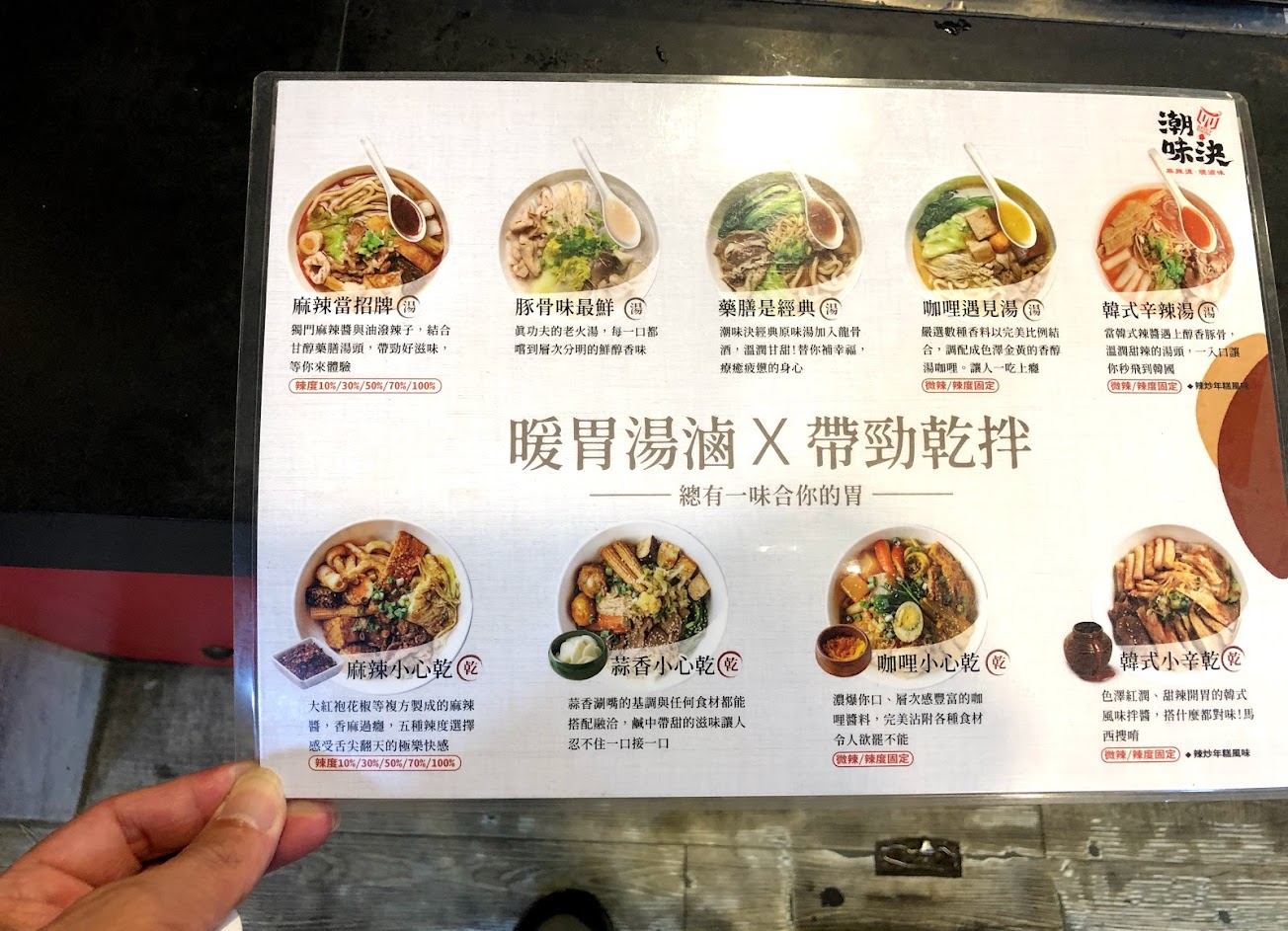 乾濕選擇,湯汁也有四五種選擇,麻辣湯可以選擇辣度
