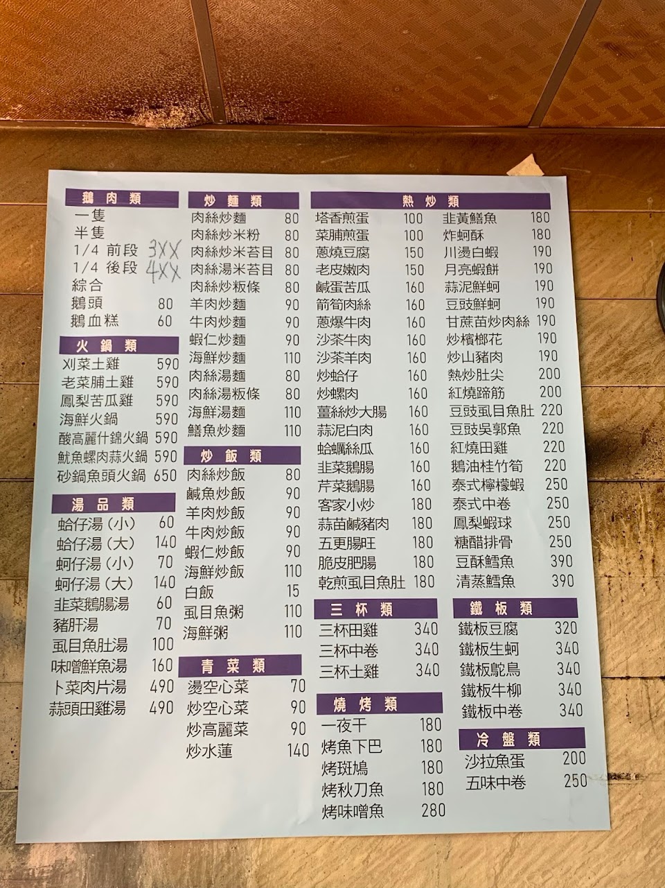 在熊貓上看到這家店以後決定去現場吃看看,店面位子巷子裡面,座位很多,環境就很正常的快炒店的感覺,沒有髒亂但也說不上窗明几淨。因為這家店收Under和foodpunda的單,雖然現場沒什麼客人但是老闆一直忙碌的出菜。說實話現場吃真的讓人驚艷,鵝肉1/4盤450元很大盤而且鮮嫩好吃,鵝血糕調味很特別也好吃,炒鱔魚意麵鱔魚不多,但味道還是很不錯的。老闆和老闆娘感覺人很好老實,比較不會用3C產品,所以現場有出現foodpunda單出問題,我們還幫忙解決。推薦大家可以去現場吃看看。