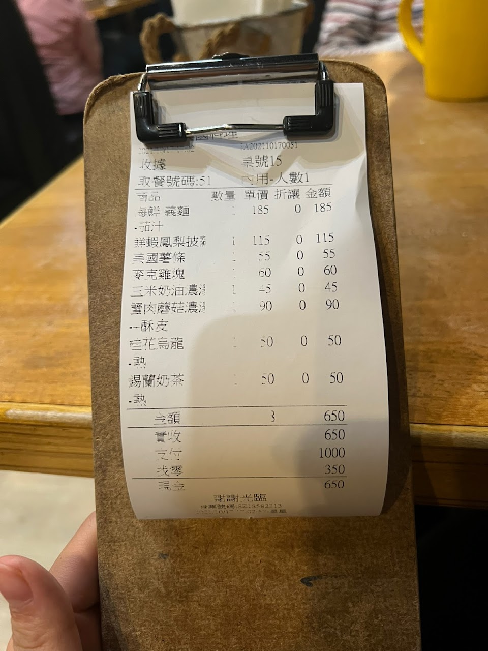 沒有套餐的選項,只點了清炒蒜味海鮮義大利麵220跟香草拿鐵95,麵吃起來比較像洋蔥濃湯口味,清炒比較湯汁應該少一點,熱香草拿鐵太甜,別桌的果汁看起來比咖啡好,低消100元,不限時,有免費wifi, 環境很適合聊天