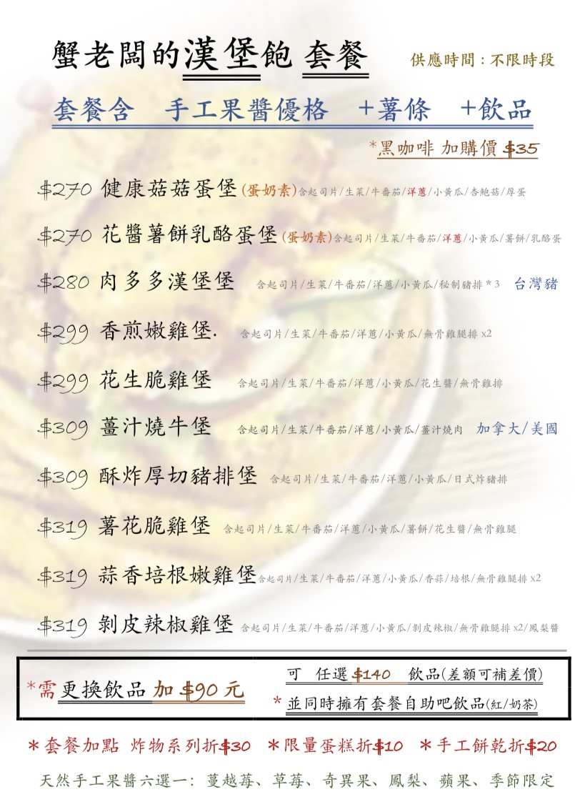 餐點內容眾多,推薦早午餐、總匯與漢堡系列,價格實惠且美味。漢堡和總匯很類似,但是一者是漢堡包一者是吐司,配料多樣美味,加上新鮮現做味道都很不錯,漢堡和總匯內有常見的蔬菜萵苣、番茄、洋蔥等;早午餐系列也是很好的選擇,不同套餐的內容不盡相同,有些是類似美食拼盤的料理,炒蛋、培根、沙拉等,有些則很有特色,像是燻雞蛋配麵包。