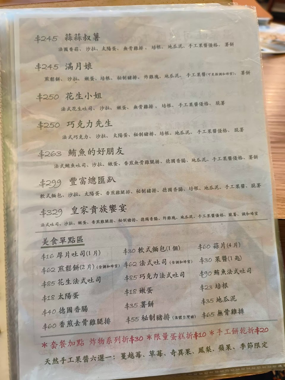 很多餐點可以搭套餐或是本來就有附餐,薯條、免費奶茶紅茶,其中果醬優格最讓人驚艷,果醬都是店家自製,不同季節會有特別的果醬,像是夏季有桑椹果醬。