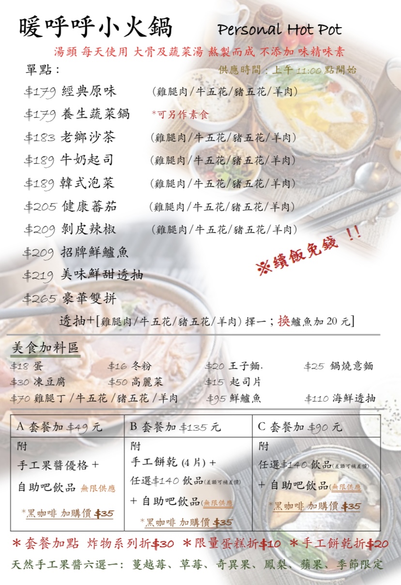 菜單選項超多點餐套餐規則也好多好複雜。小火鍋很不錯看到很多人點,一人鍋不會太小喔!是煮好端出來的,不是卡式爐自己煮的。湯頭都還不錯好喝,店員說沒有味精。一鍋裡面火鍋料高麗菜都比想像中還多真不錯??然後附一碗白飯小小的蠻可愛的(是可以免費續飯)