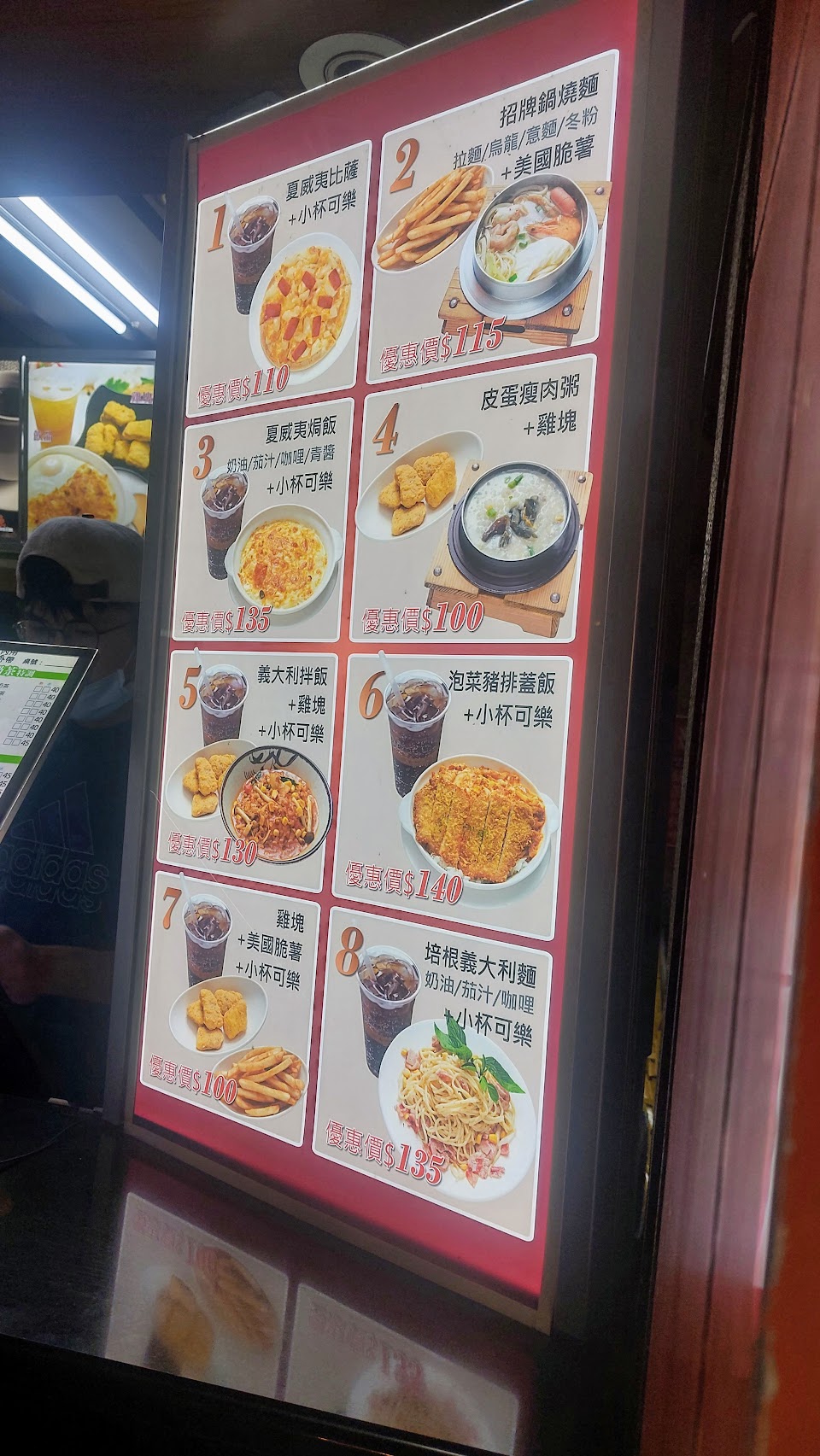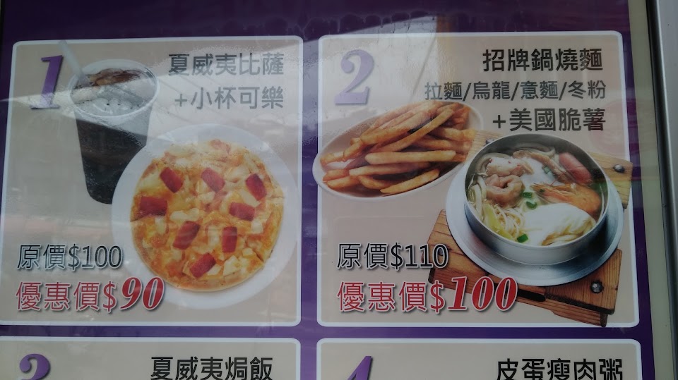 培根意大利麵, 焗烤咖喱飯, 海鮮披薩, 美國脆薯, 青醬蛤蜊焗飯